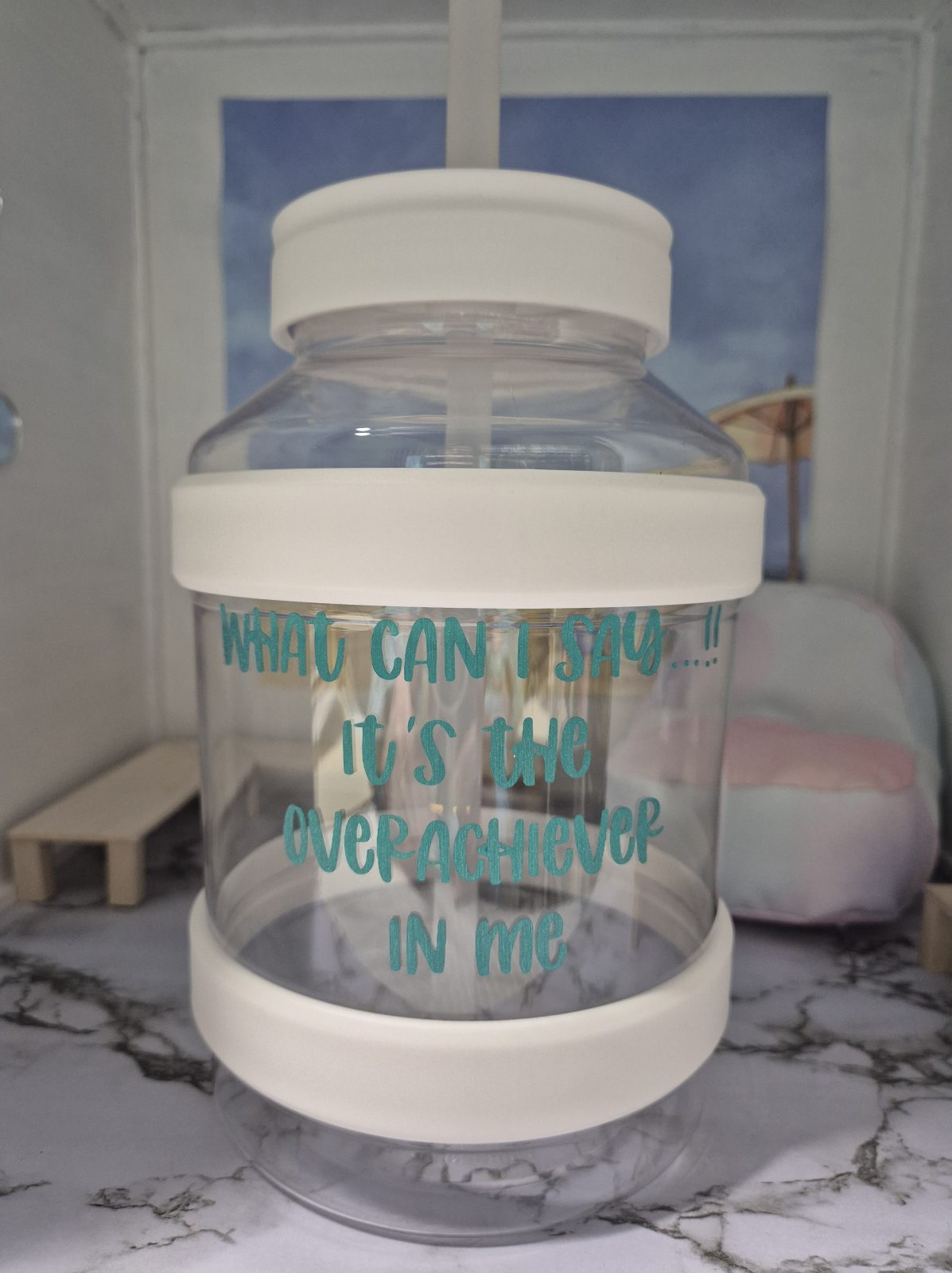 Water bottle that holds 2 Litres.Ā Quote on the front saying, “What Can I Say….!!Ā It’s The Overachiever In Me”.Ā Definitely something for the fitness friend that has it all…..