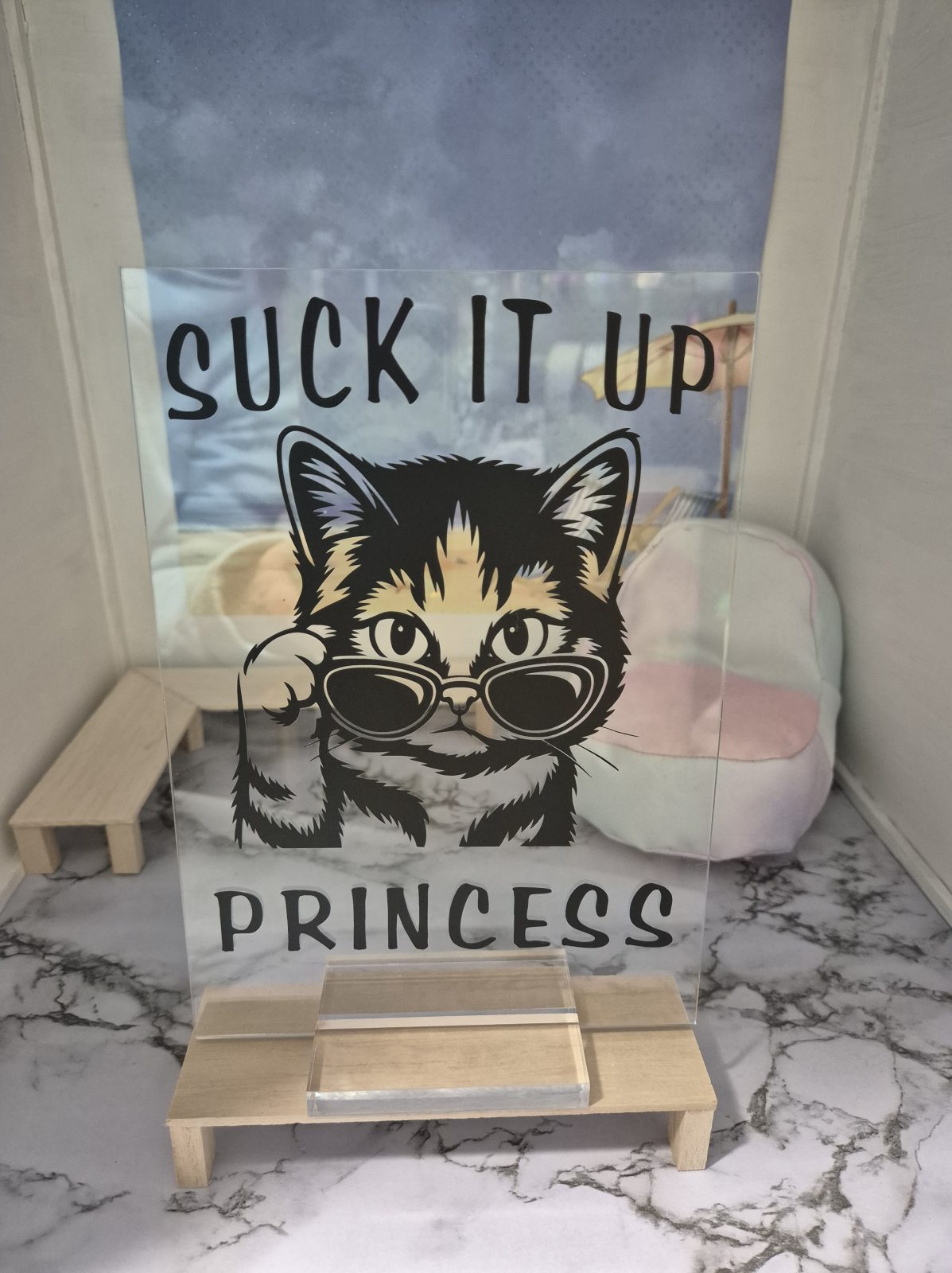 Acrylic Sign with Cat saying, “Suck It Up Princess”. Measurements are 14.5cm wide by 21cm high. Bring a smile to the office…….
