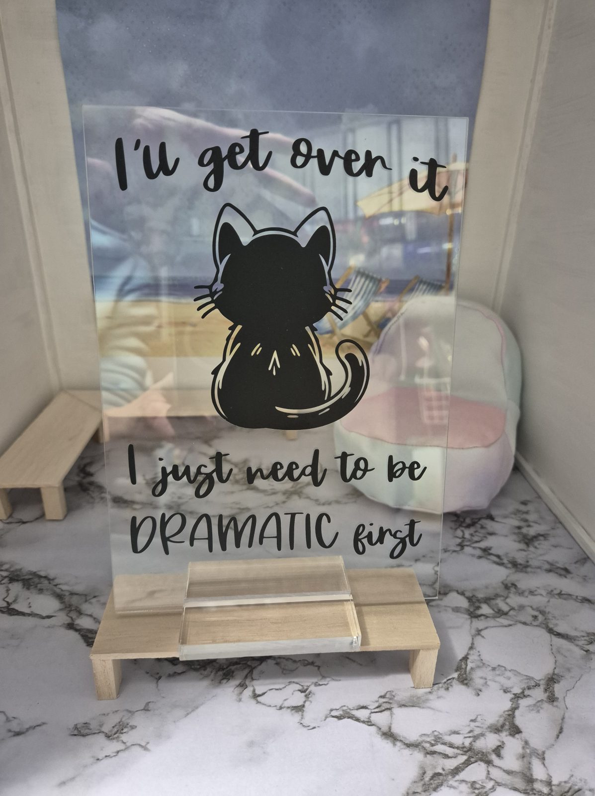 Acrylic Sign with cat saying – “I’ll Get Over It. I Just Need To Be Dramatic First”. Measurements are 14.5cm wide by 19cm high.