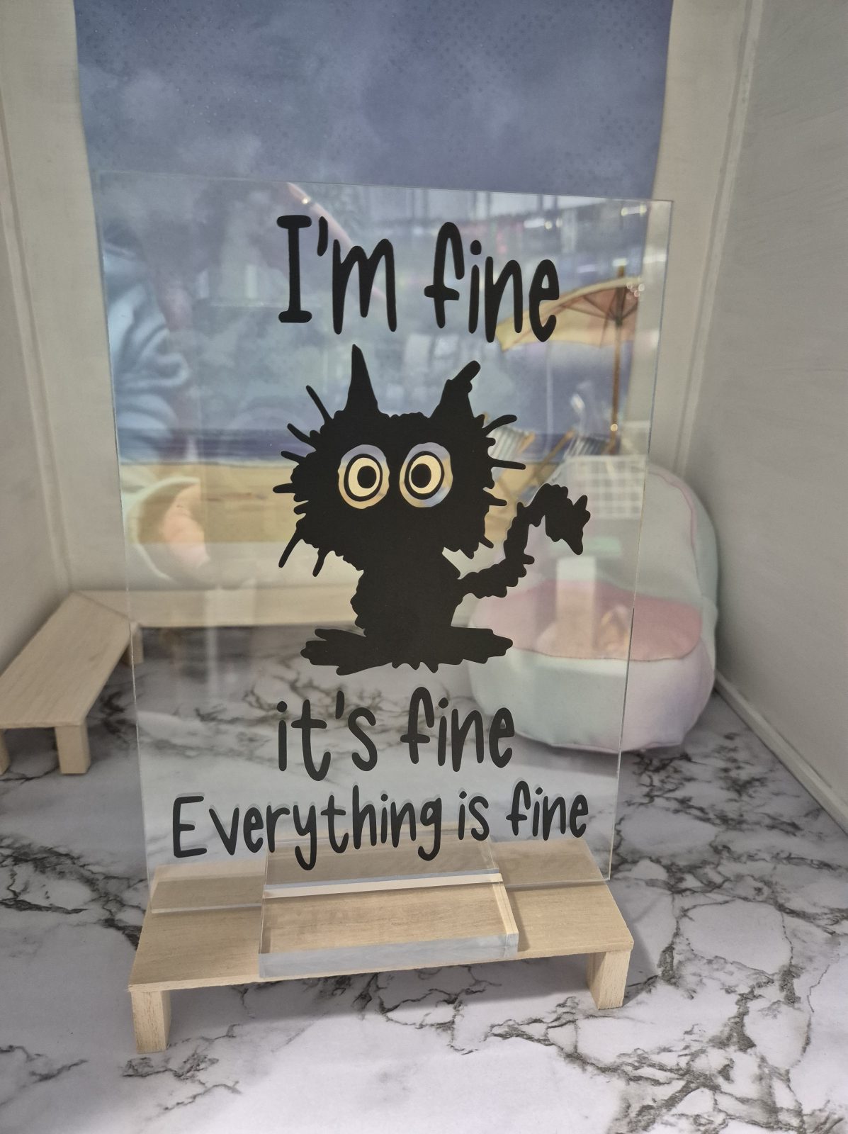 Acrylic Sign with cat saying, “I’m Fine, It’s Fine, Everything is Fine”. Measurements are 14.5cm wide by 21cm high.