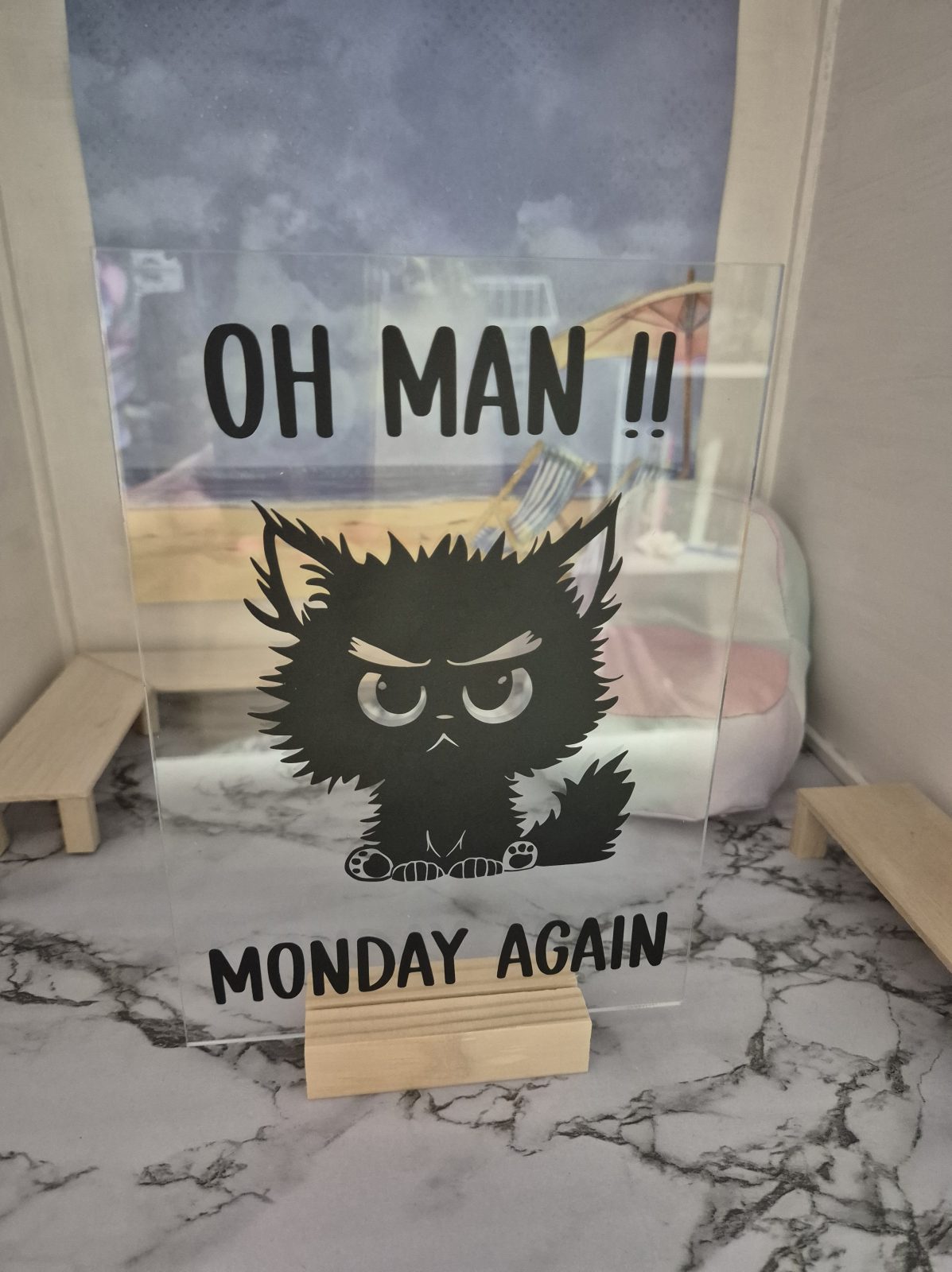 Acrylic Sign saying, “Oh Man!! Monday Again”.  Measuring 14.5cm wide by 21cm high.