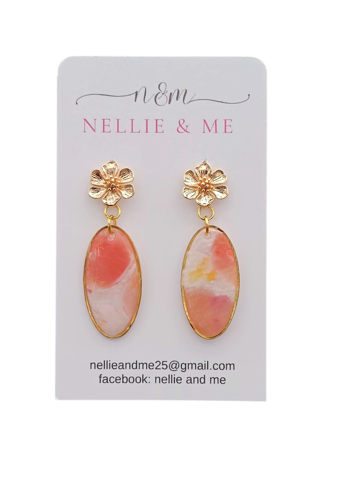 Medium sized oval dangles in hues of pale pink and apricot on a white background