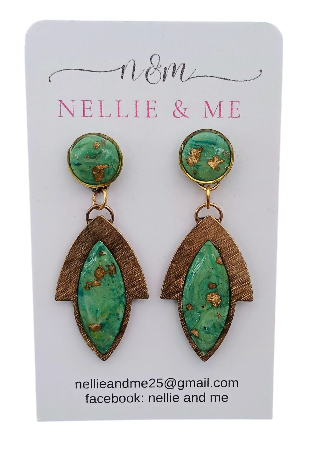 Artistic, two-tiered arrow design with textured brass-tone metal in green and gold
