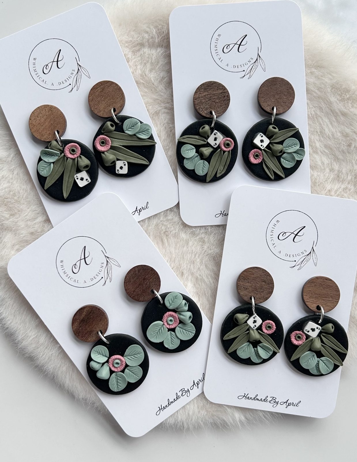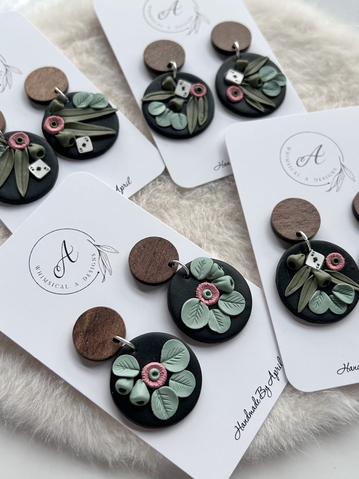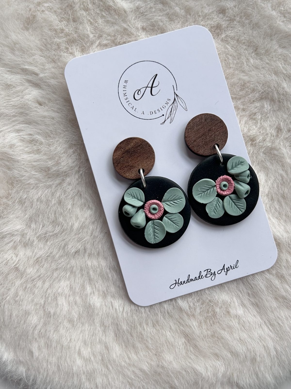 ♡ hypoallergenic surgical steel stud posts on a walnut-stained wooden component