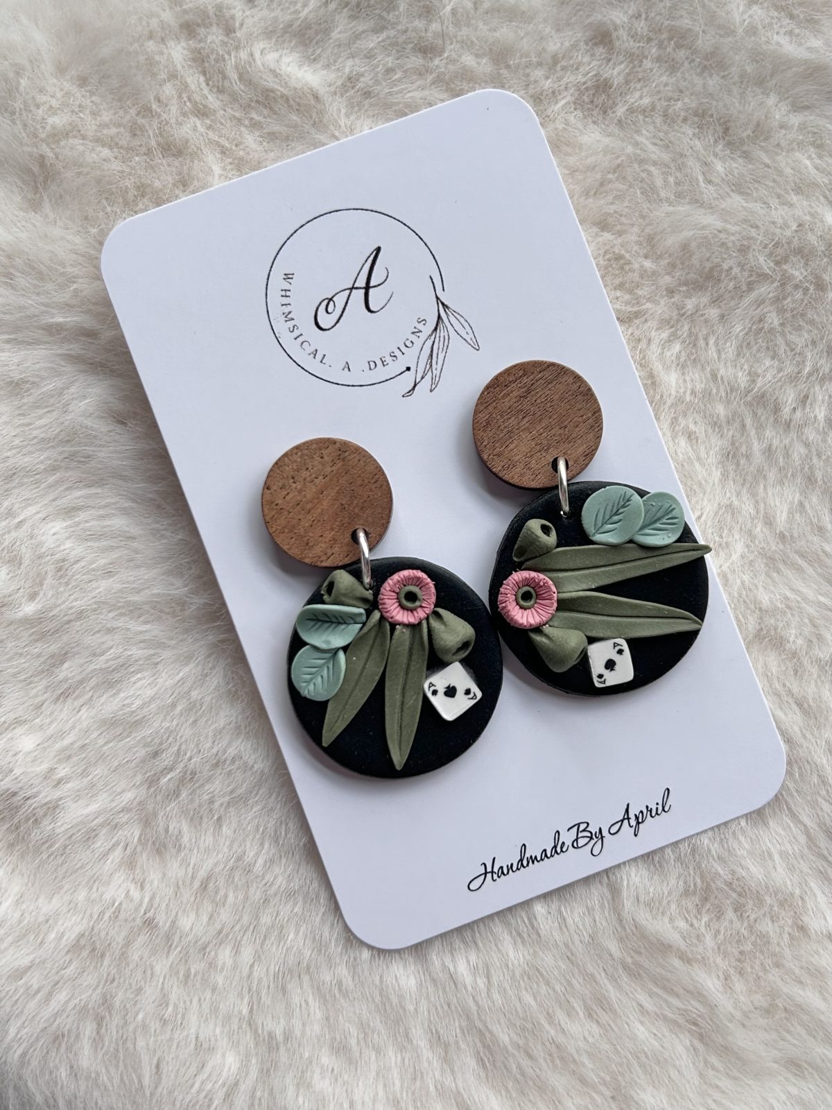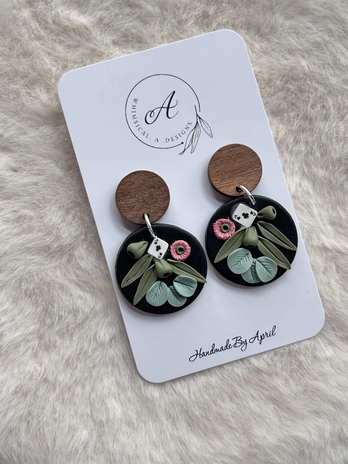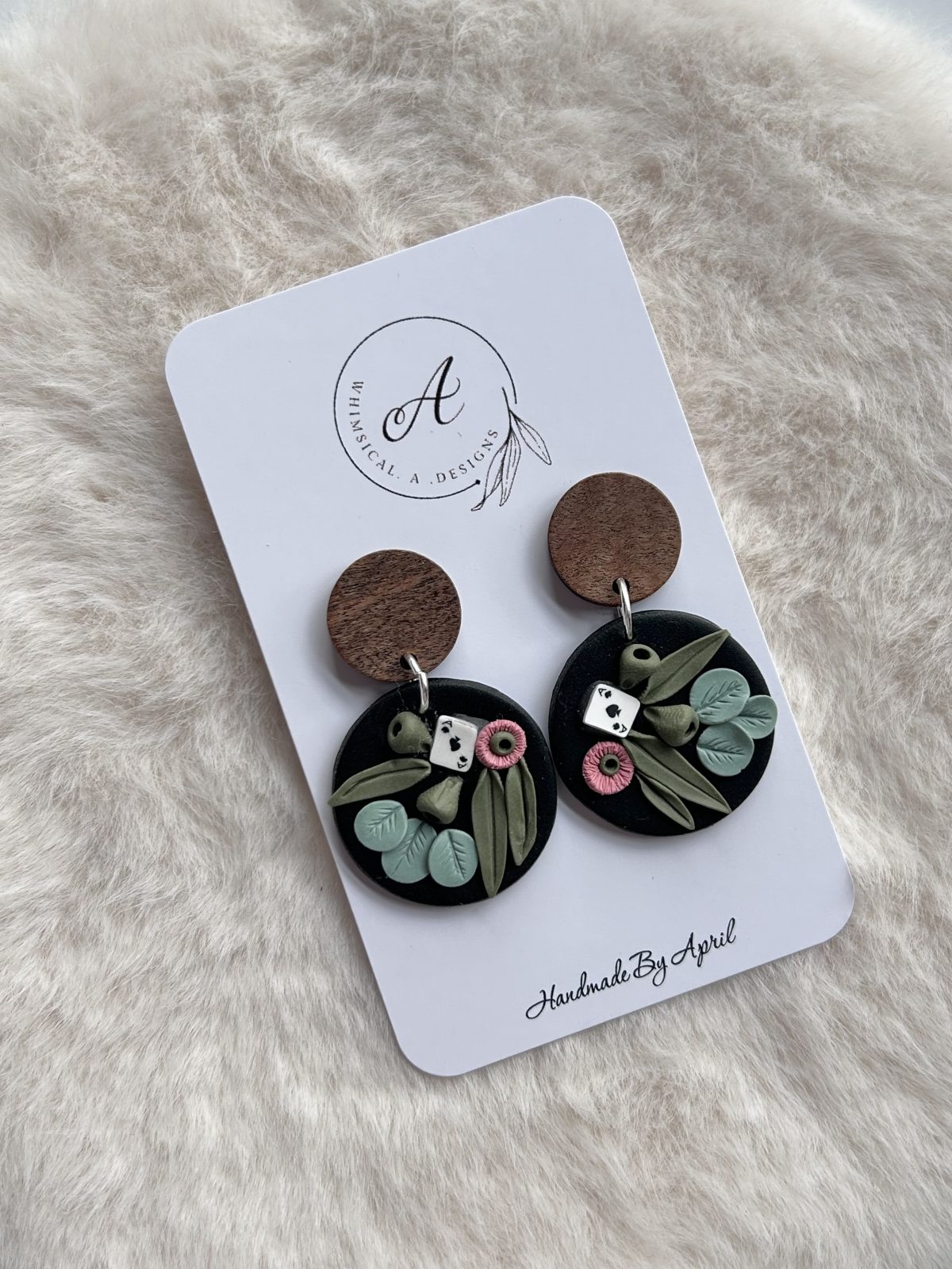 ♡ hypoallergenic surgical steel stud posts on a walnut-stained wooden component