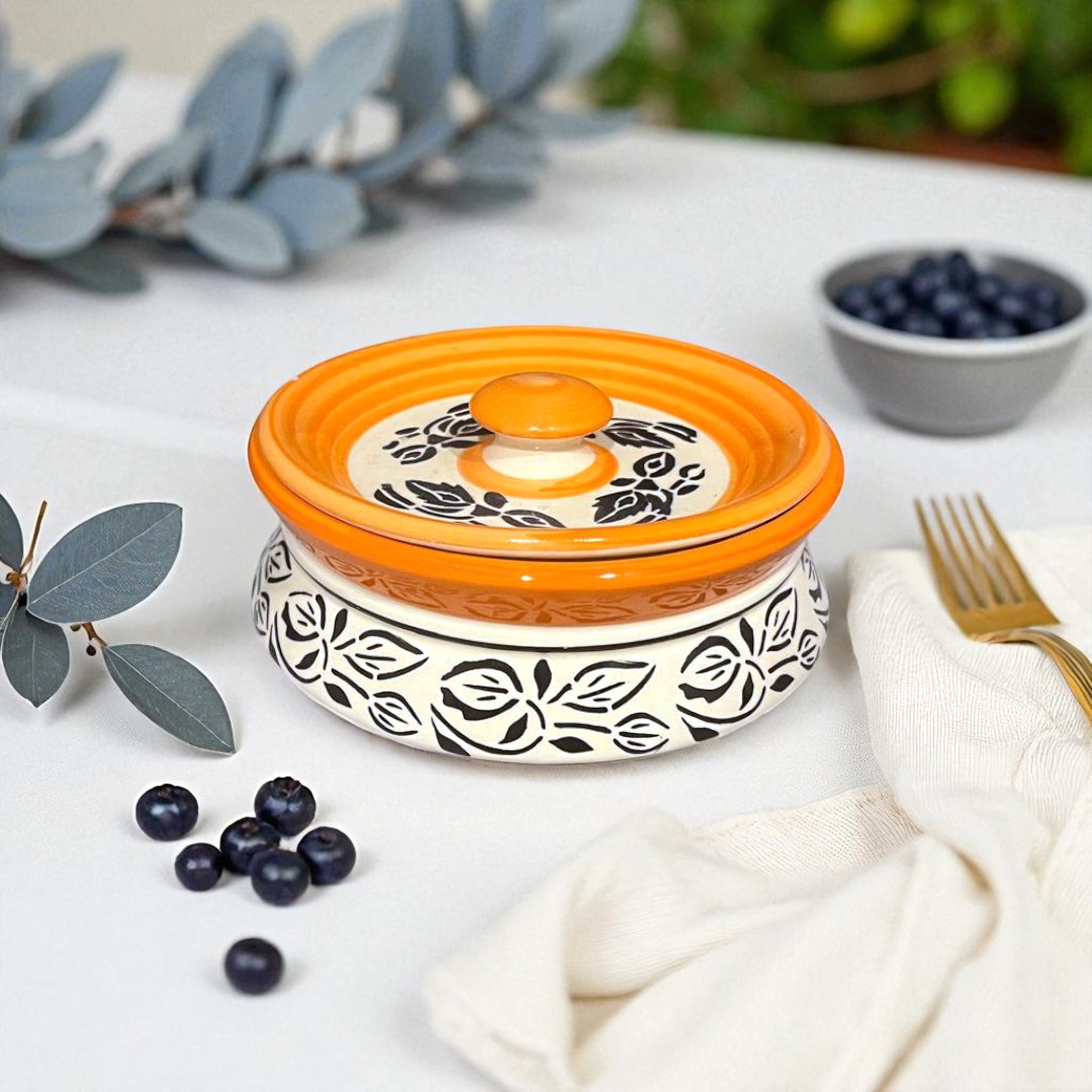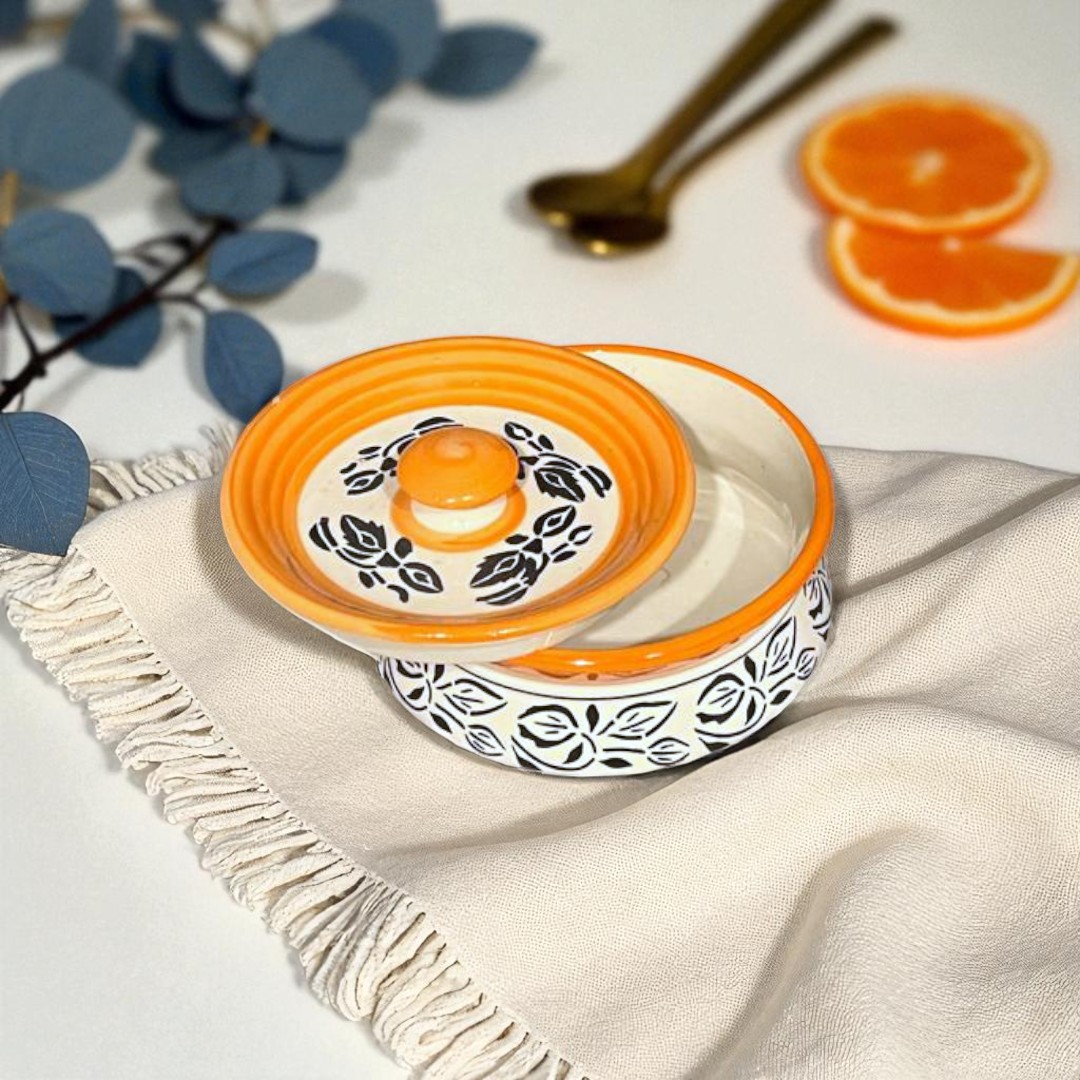 Elegant and enchanting, this Handmade Ceramic Vessel features a delicate blue floral pattern on a soft off-white base, beautifully accented with burnt orange rims on both the jar and lid. The lid with a rounded knob handle makes it perfect for storing tea, spices, sugar, or treasured keepsakes.