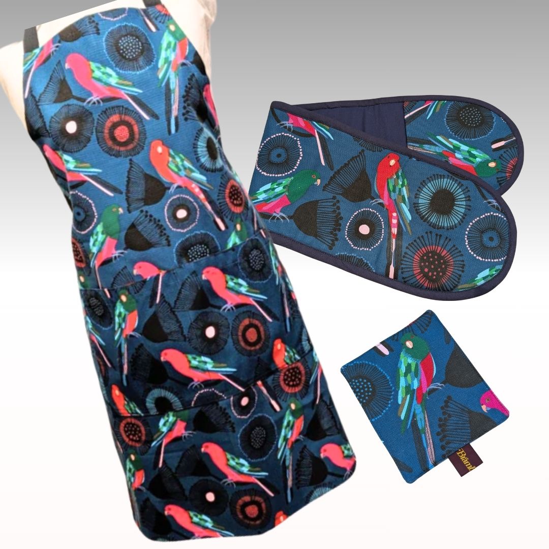 Our Brambleberry Hampers are a perfect gift for the baker/cook in the family. The hamper contains an adult bib aprons, a double oven mitt and a jar opener. All in a matching print.