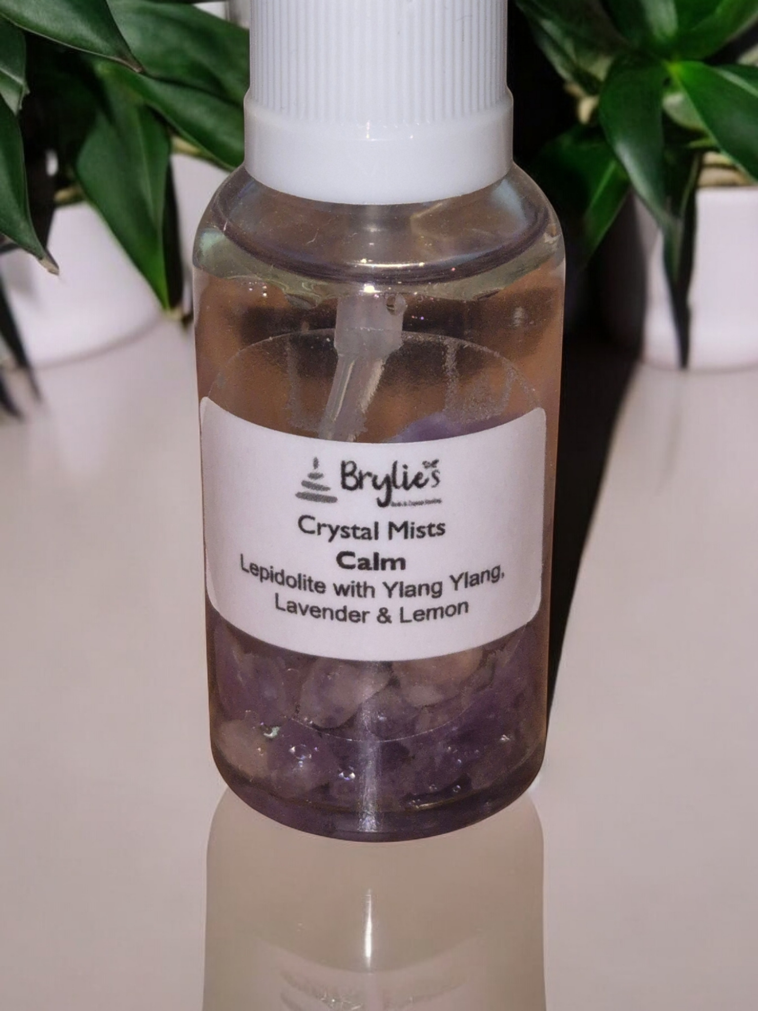 Spritz yourself with a calming blend of Lepidolite crystals infused with Ylang Ylang, Lavender and Lemon Essential Oils from doTERRA.