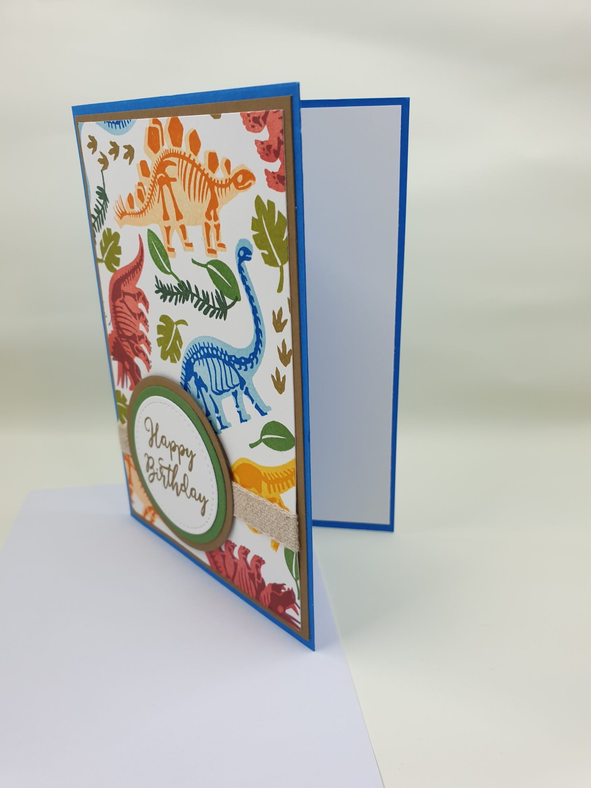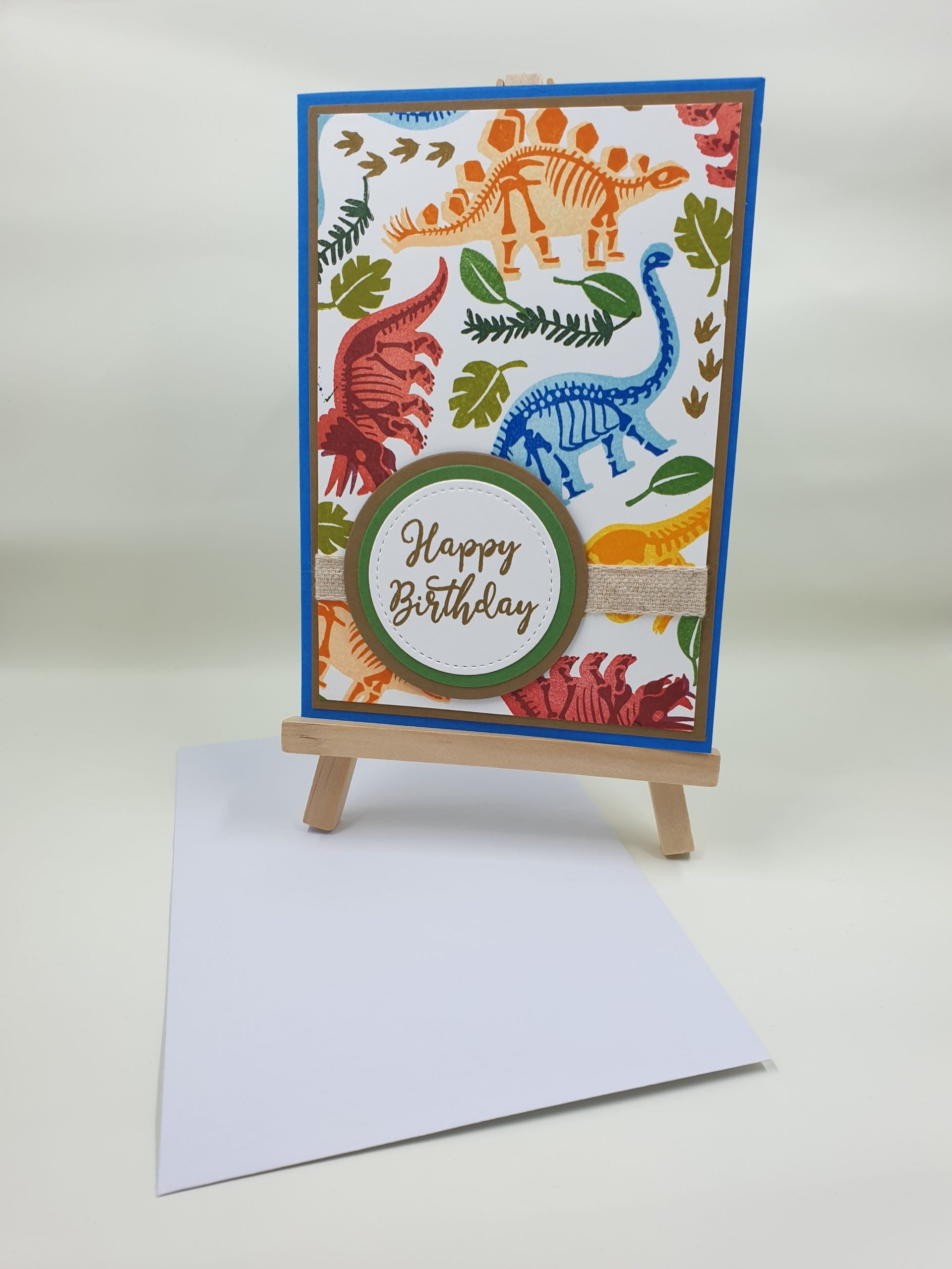 A6 size blue card with multicolour dinisaur pattern, Happy Birthday stamped on layered brown & green circle. Blank white panel inside. Envelope included