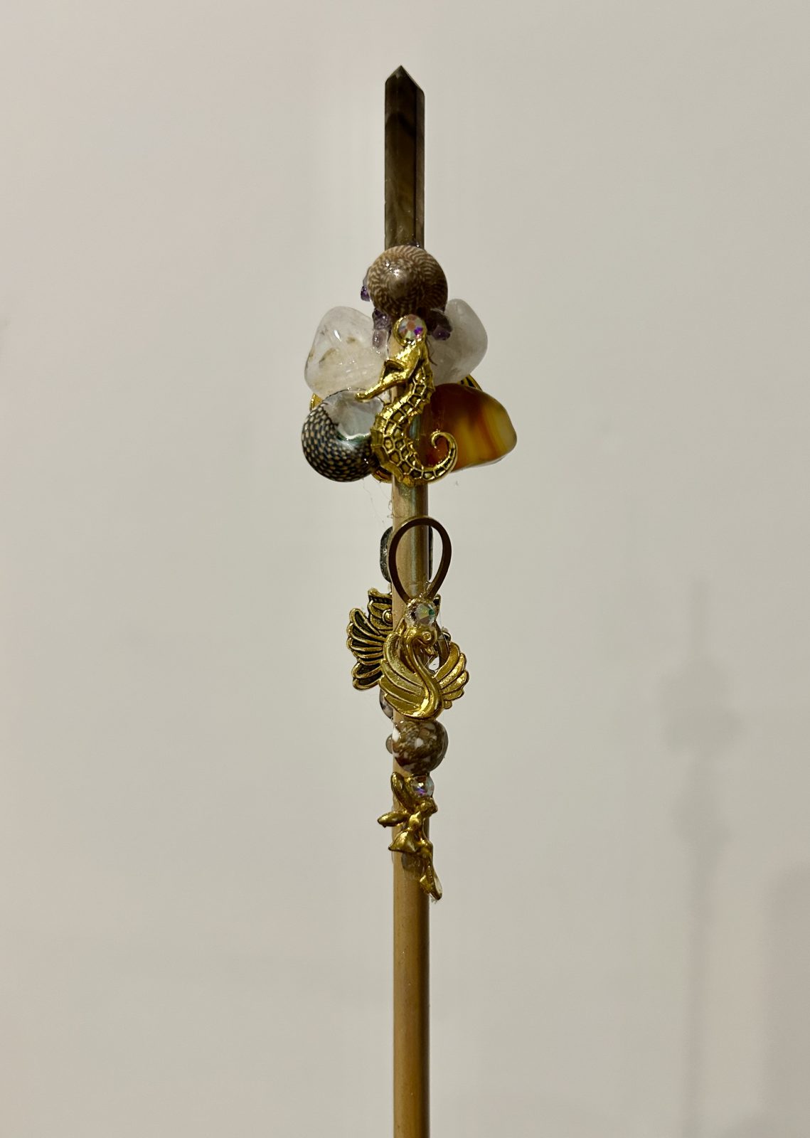 With special connections to the crystals in their presence this ultimate generator of magical powers is a wise and powerful wand. Teaching to embrace life and love without fear this intricate wand is hand crafted with precision and great joy. Holding passion and the power of protection.