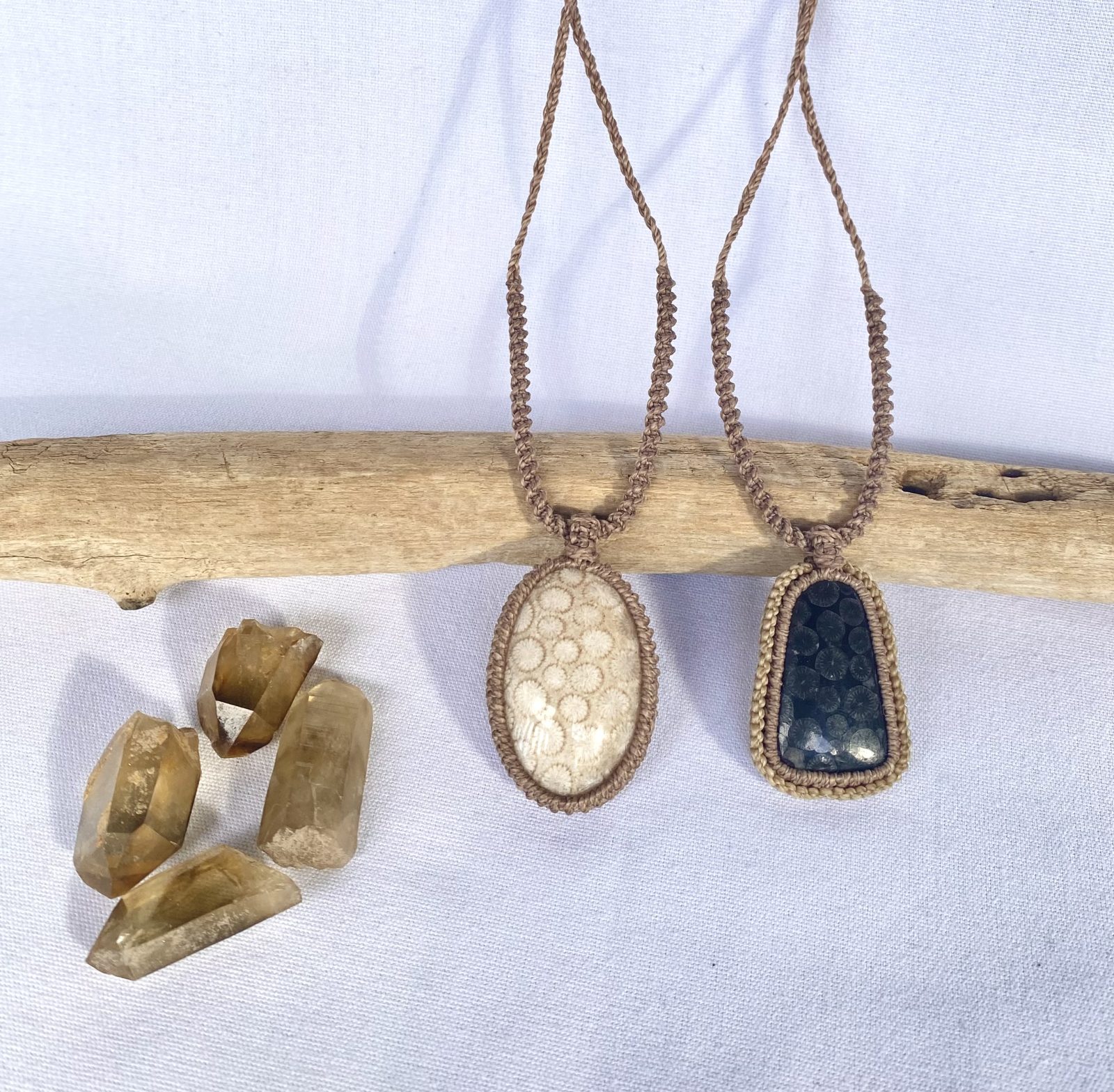 Both of these necklaces are wrapped in a natural brown thread. The black piece of Fossilised Coral has an outer layer in sand coloured string.Â