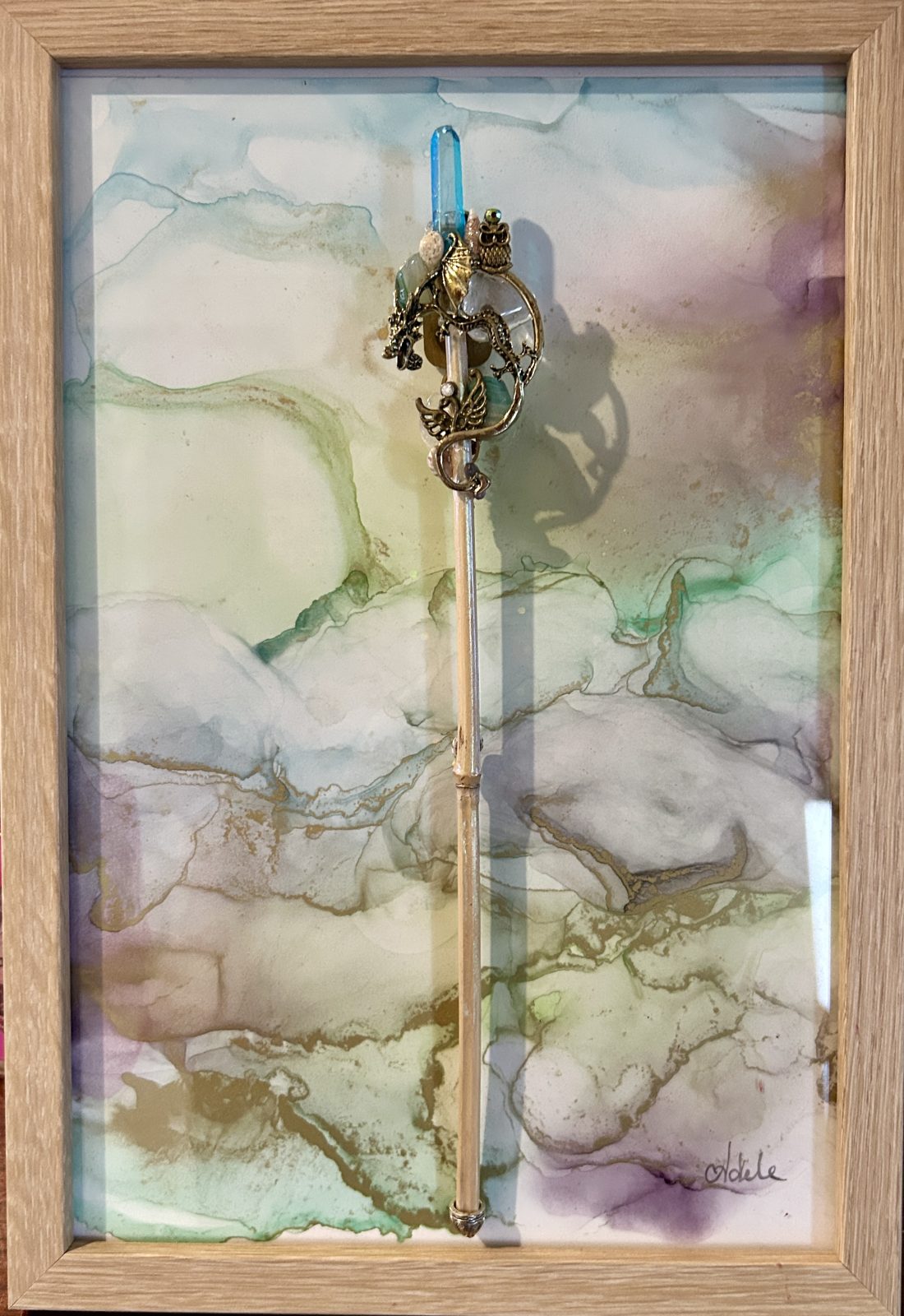 With special connections to the crystals in their presence this ultimate generator of magical powers is a wise and powerful wand. Teaching to embrace life and love without fear this intricate wand is hand crafted with precision and great joy. Framed over original art depicting the wands aura and providing it with a home.