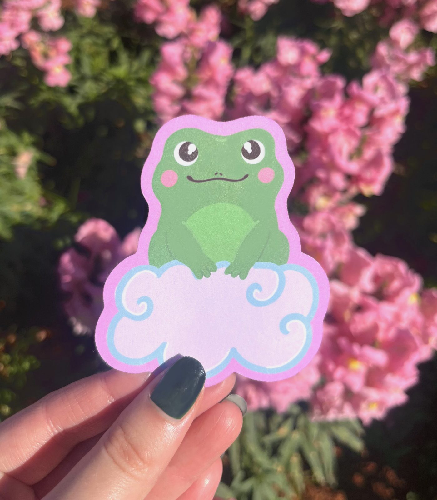 Dreamy skies and cozy vibes 🌥️🐸 this Frog on a Cloud Sticker brings a touch of whimsy wherever it goes. Featuring a sweet little frog perched on a fluffy cloud, it’s perfect for anyone who loves cottagecore, fantasy, or just a sprinkle of joy.