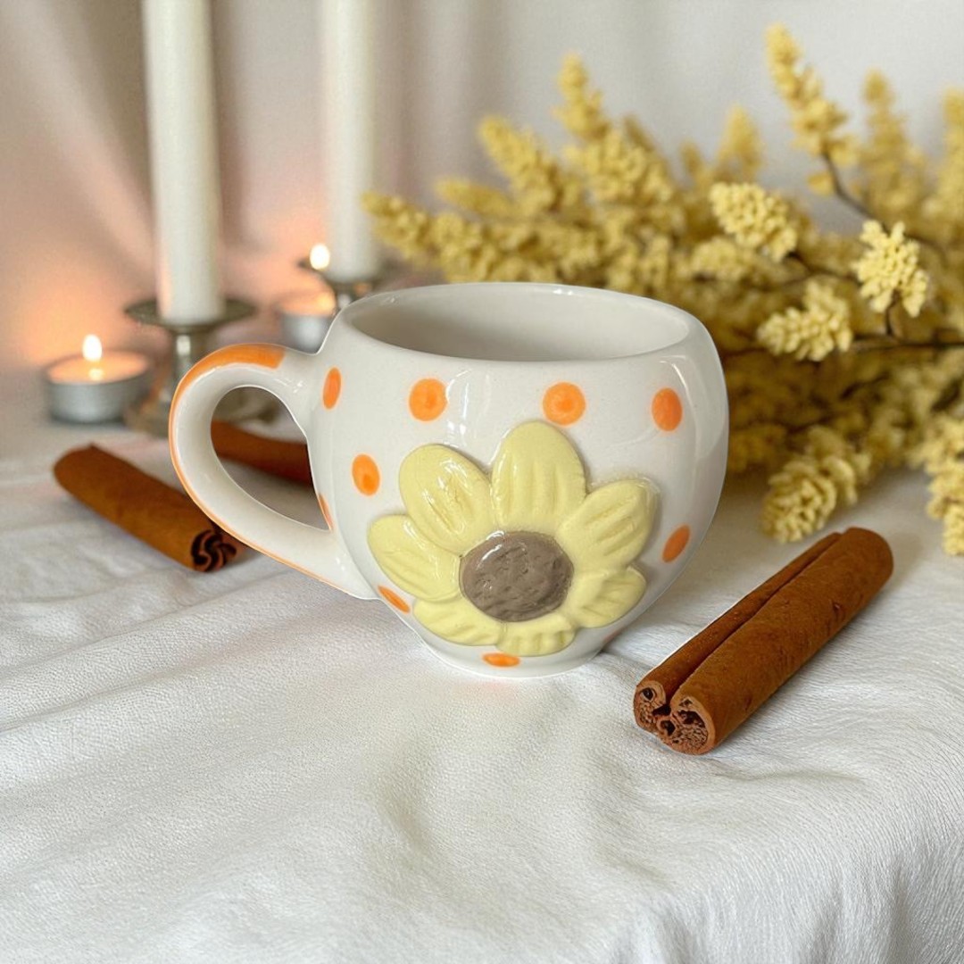 Brighten your sip with this Handmade Sunflower Cup, full of playful charm and sunny energy. The crisp white ceramic is dotted with cheerful orange polka dots, while a 3D sunflower blooms along the side, adding texture and whimsy to every drink.