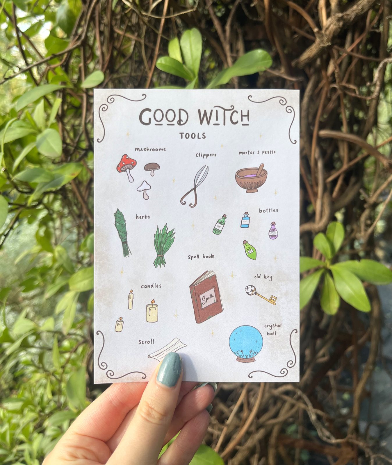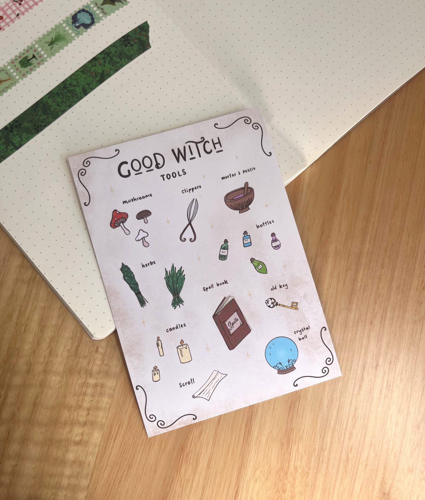 A magical display of the tools every witch needs 🪄✨ this Good Witch Tools Art Print showcases whimsical illustrations of cauldrons, herbs, crystals, and other mystical essentials. Perfect for adding a cozy, witchy touch to your walls, desks, or creative spaces.