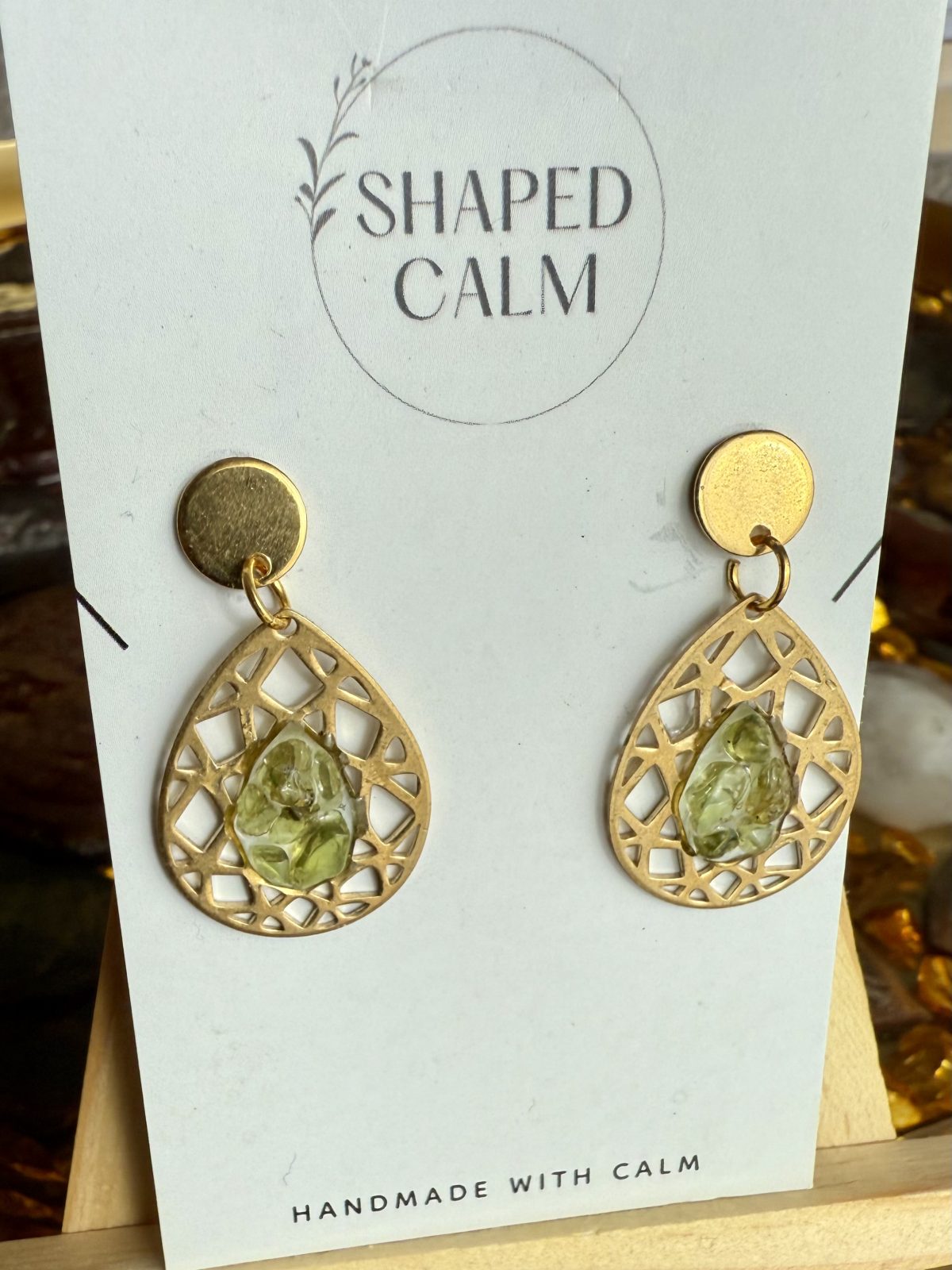 Green stone framed in gold teardrop dangle earringsAvailability: 1 in stock
