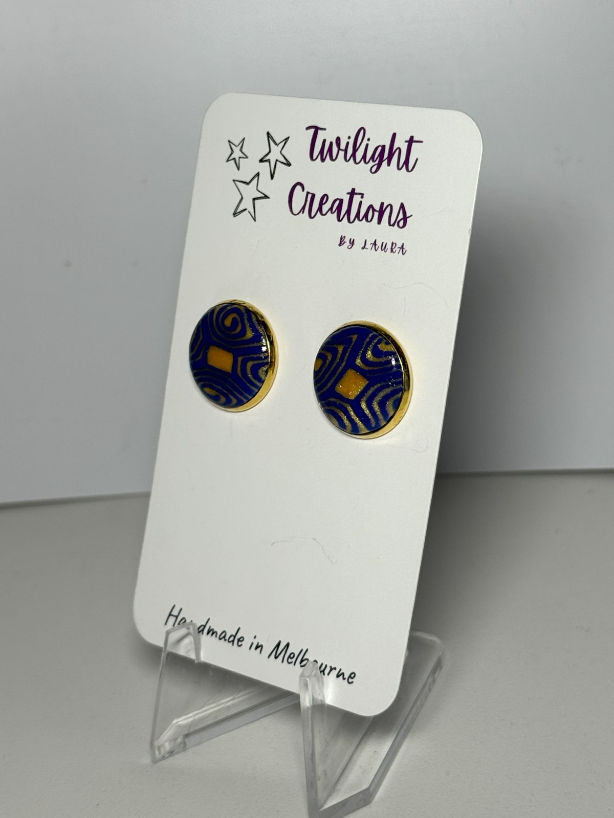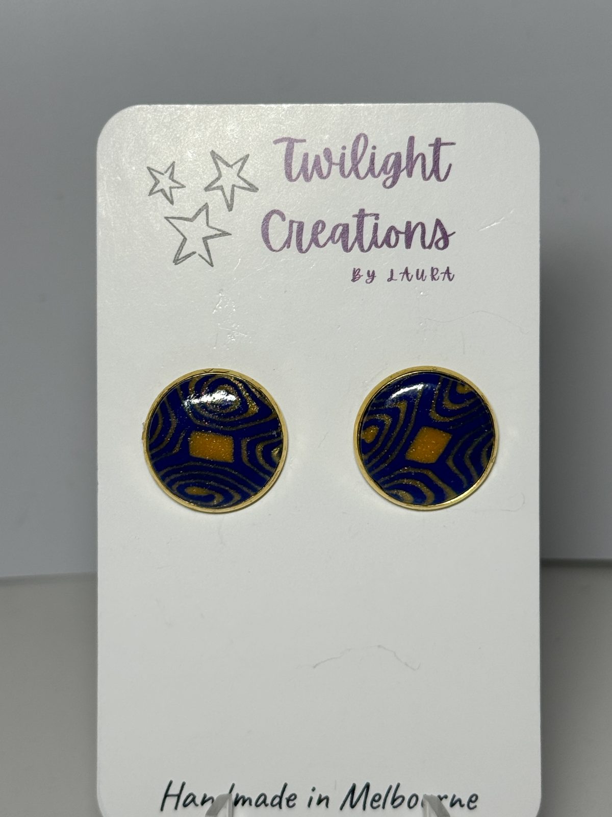 These hand-crafted polymer clay earrings feature a gold-plated stainless-steel bezel setting fitted with a navy and gold polymer clay inner in a swirl design coated with a gloss varnish.Â