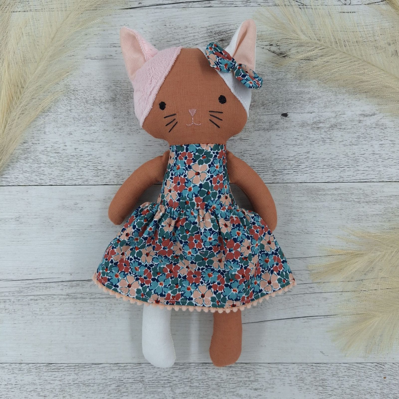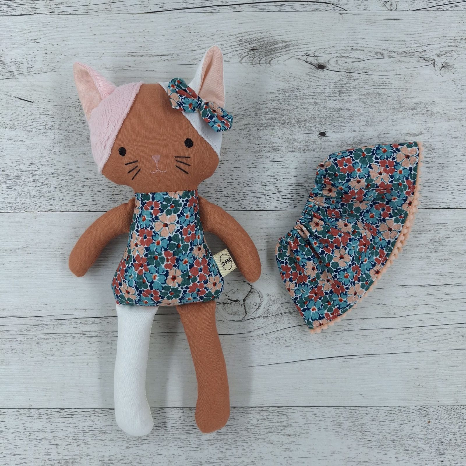 This gorgeous cat has been made with lots of love and care in my home studio in Melbourne. She features a removable skirt and is made using 100% linen, 100% cotton and minky, with quality fibre fill.