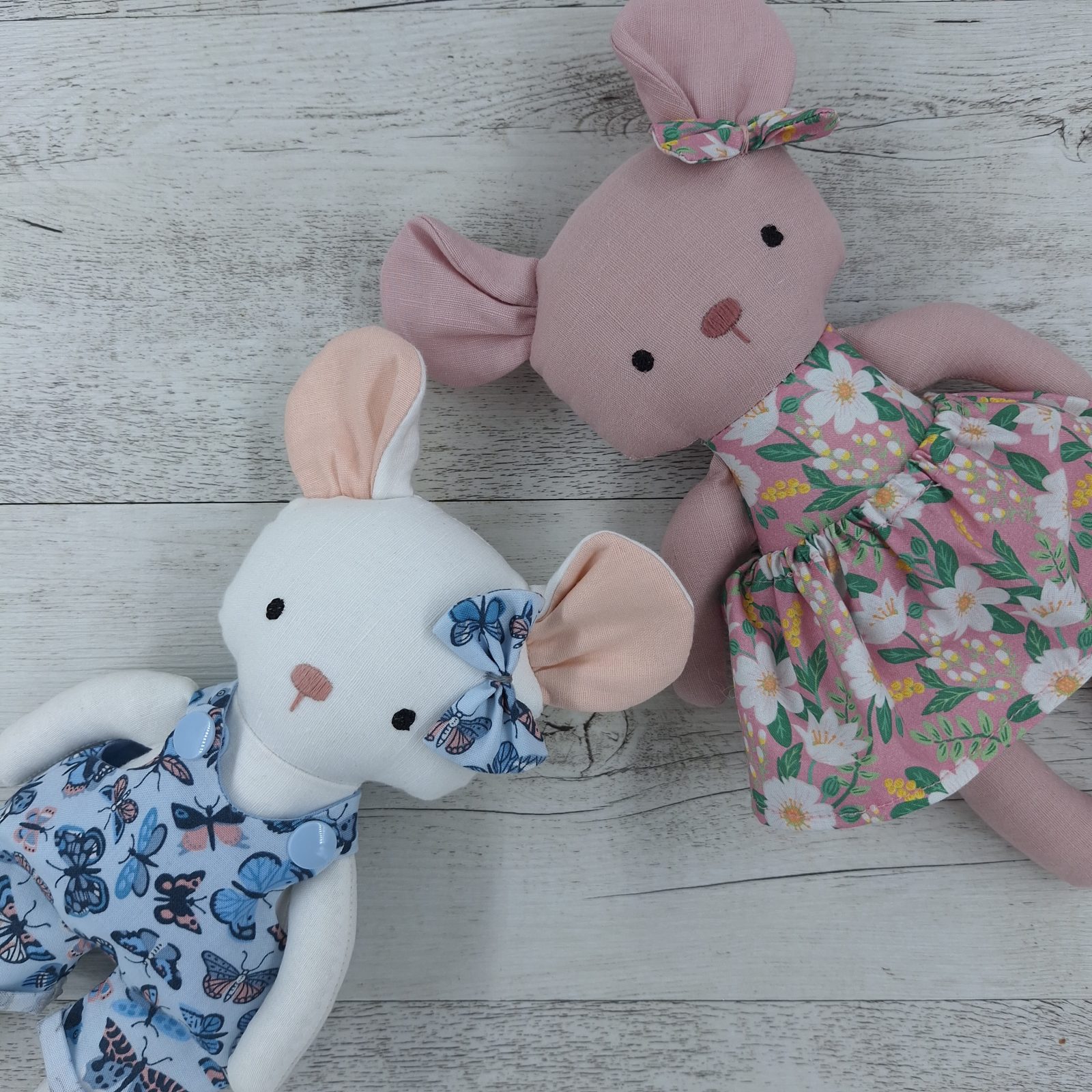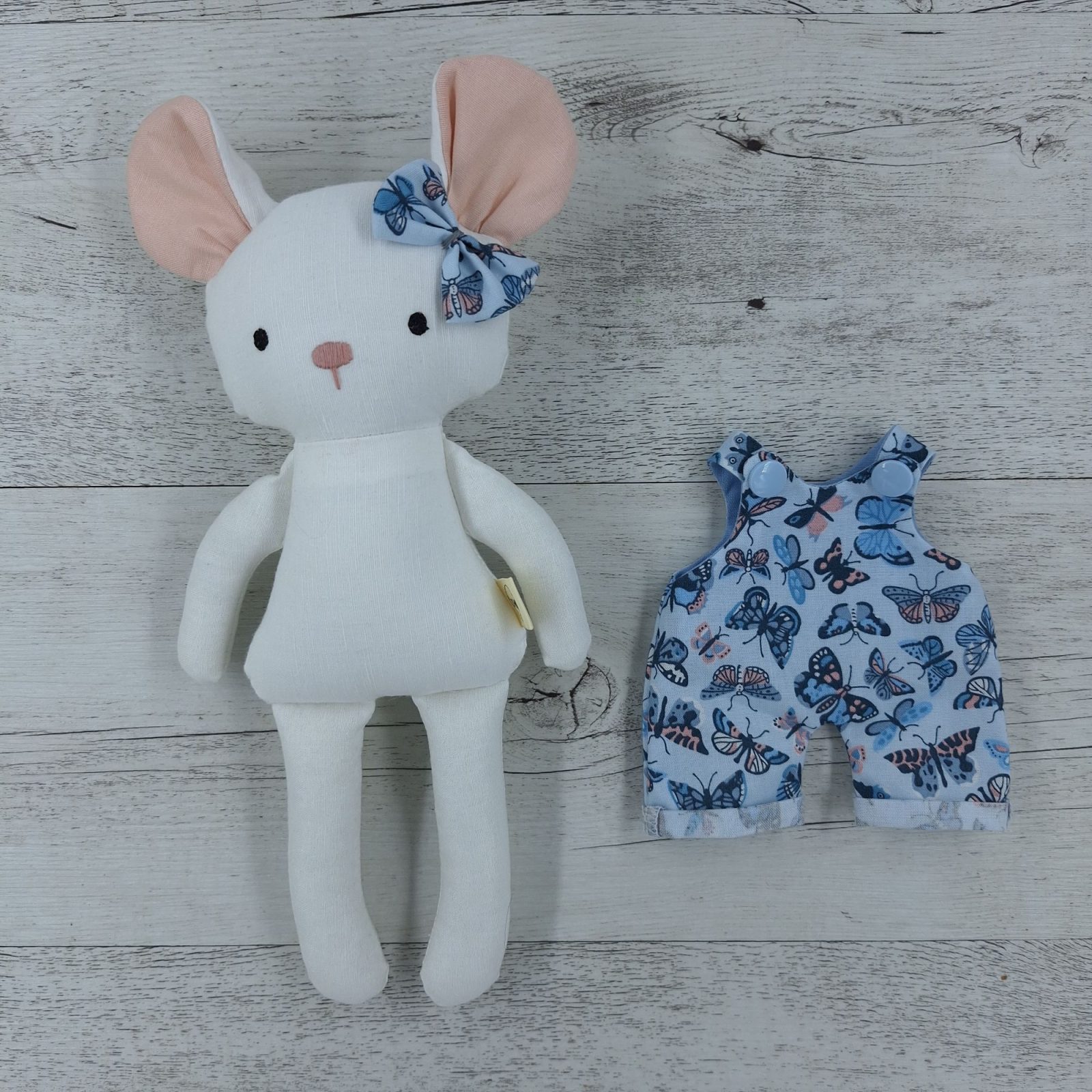 This gorgeous mouse has been made with lots of love and care in my home studio in Melbourne. She features removable overalls and is made using 100% linen, 100% cotton and plastic snaps, with quality fibre fill.