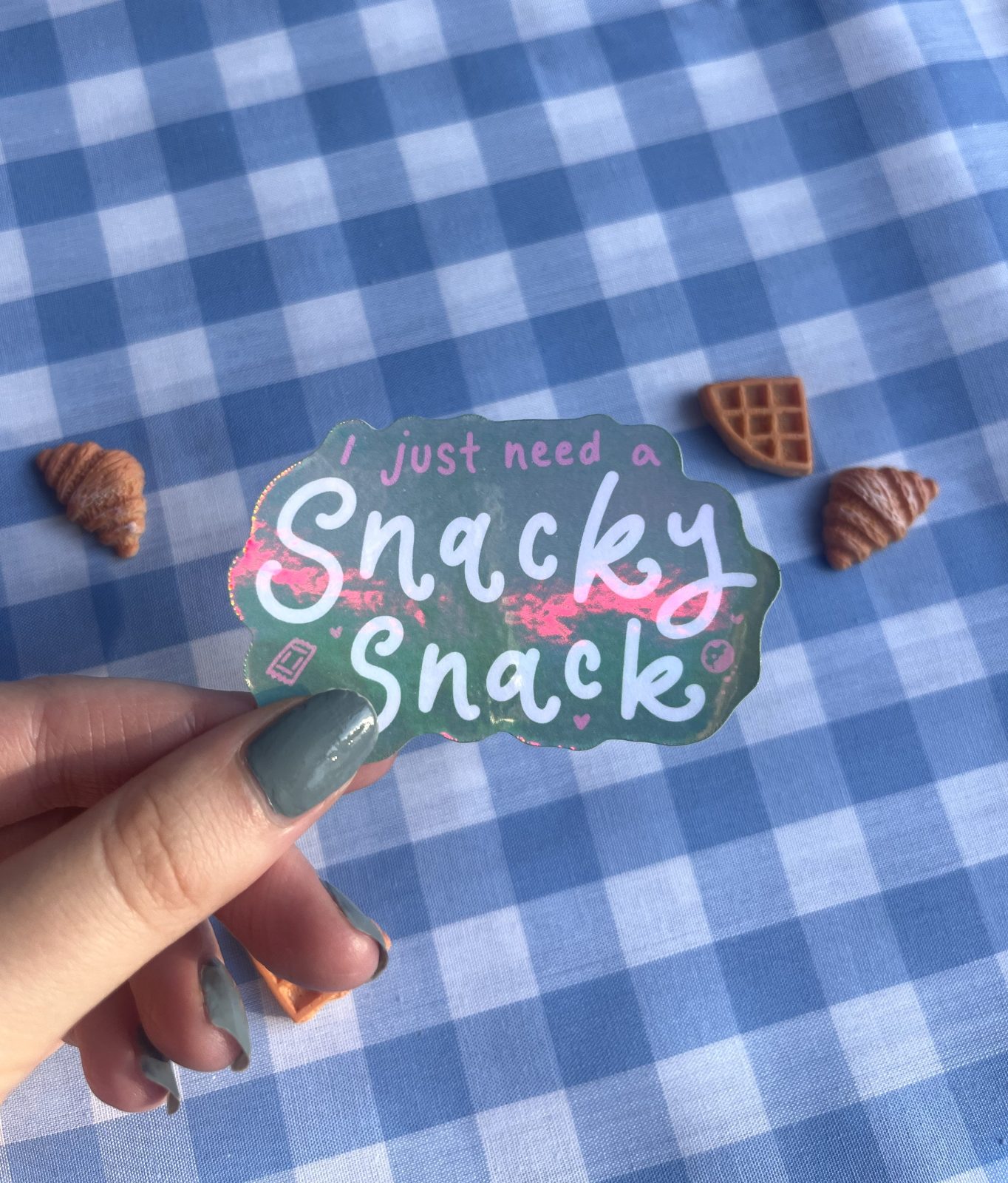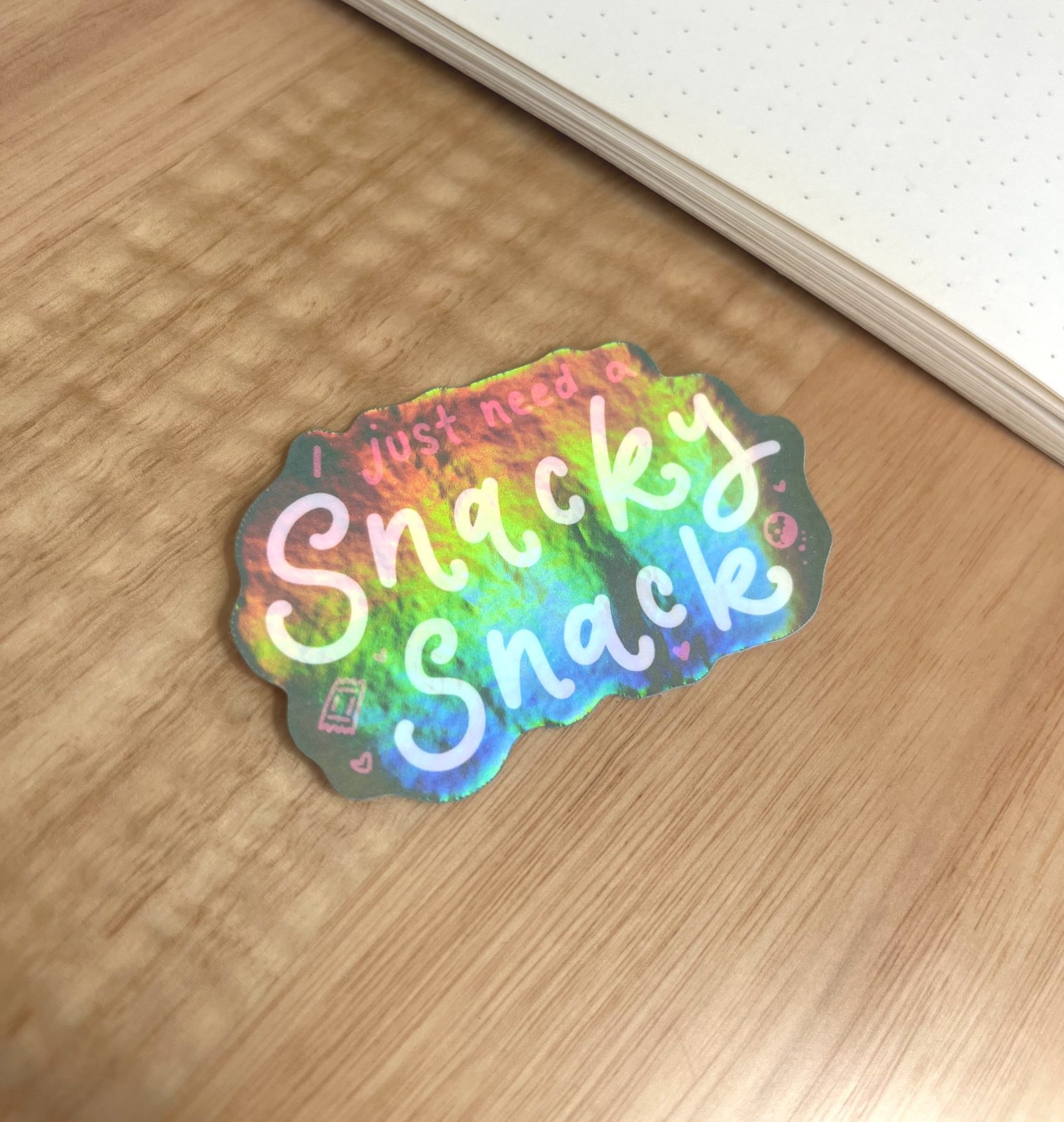 Sometimes you just need a little snacky snack 🍪✨ this I Just Need A Snacky Snack Holographic Sticker is perfect for foodies, snack lovers, and anyone who loves a playful, cozy aesthetic. The holographic finish adds a magical sparkle that makes this design pop wherever you place it.