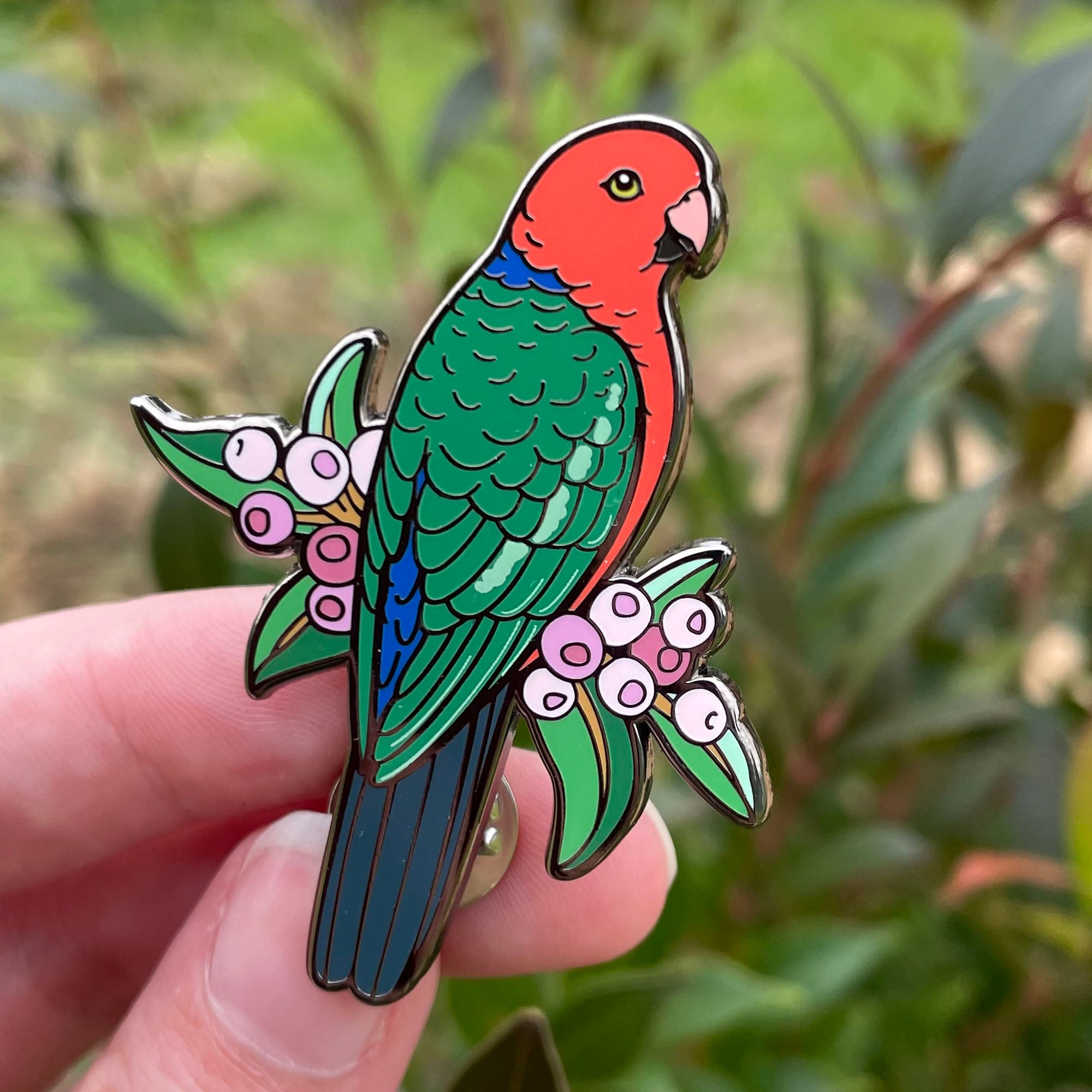 Hail to the King Parrot! This enamel pin represents the vibrancy and gentle nature of these beautiful birds. Accompanied by native lilli pilli (which these guys like to nibble on!) this design is a perfect statement pin to adorn your clothing and accessories and show your love for our native flora and fauna. This pin comes in both a male and female version.