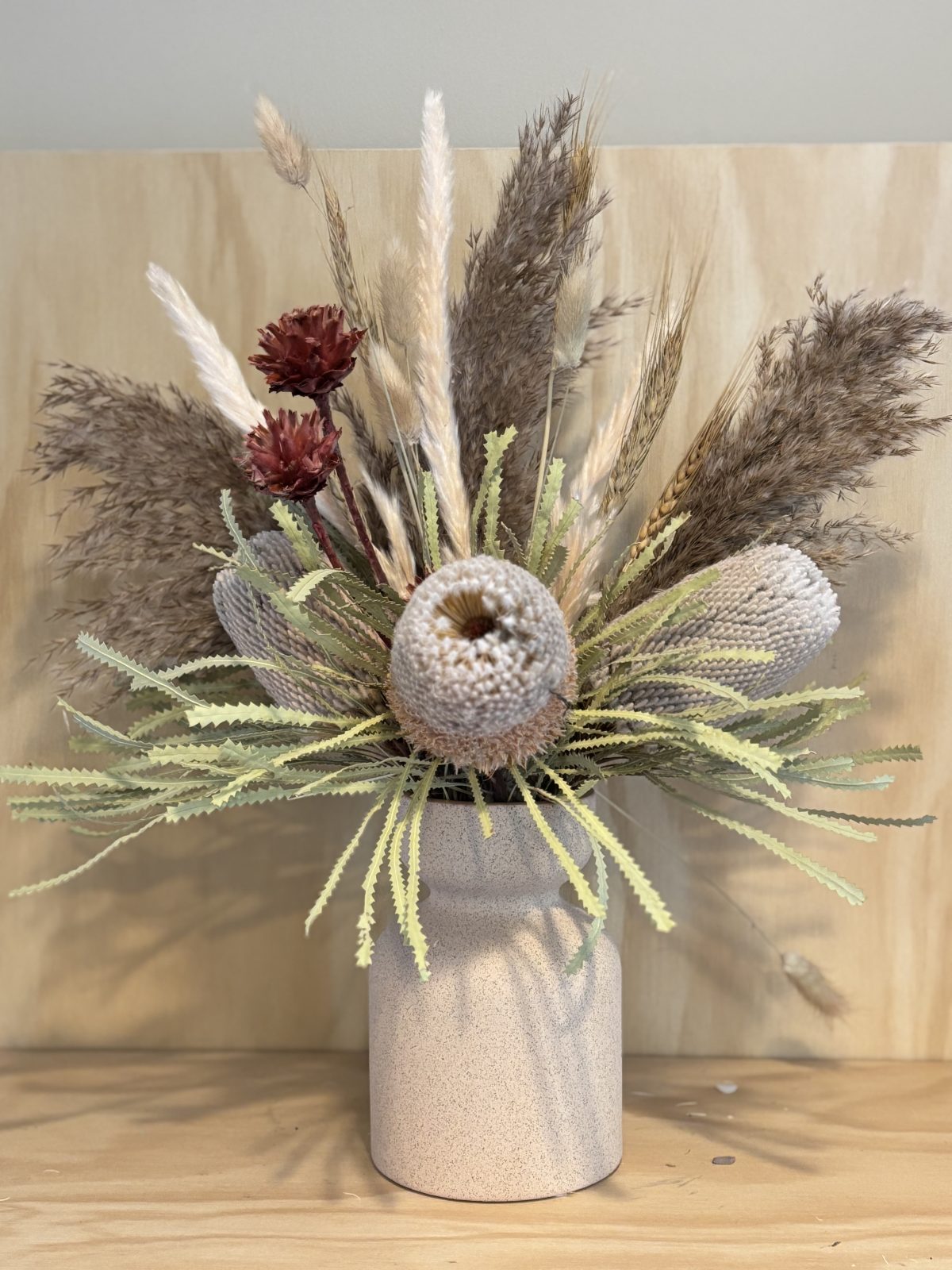 Large dried banksia floral arrangement with pampas grass in camel ceramic necked vase