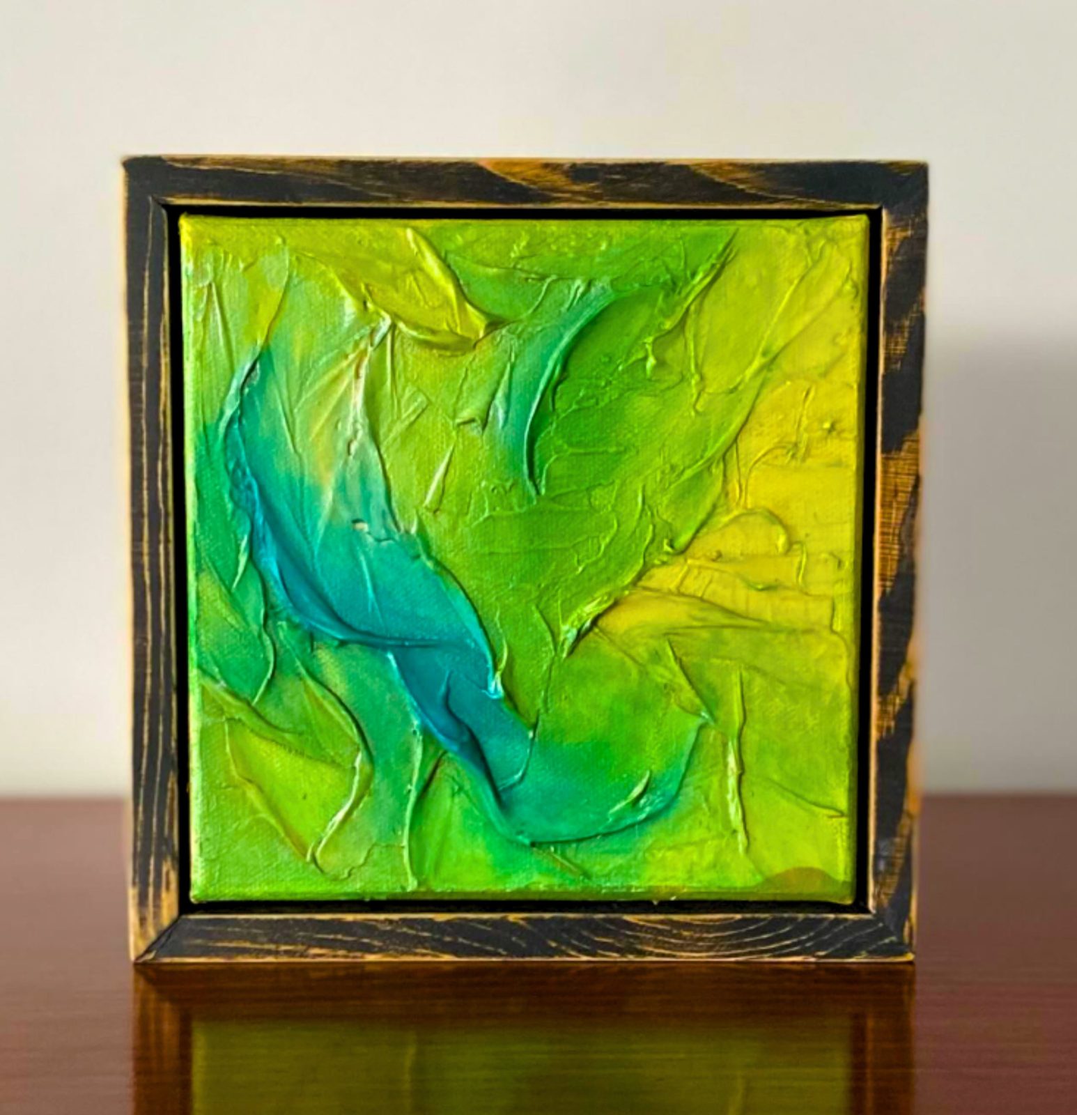 Modelling paste applied to the canvas create a textured surface while the blended acrylic paint add to the 3D look and feel of the artwork.