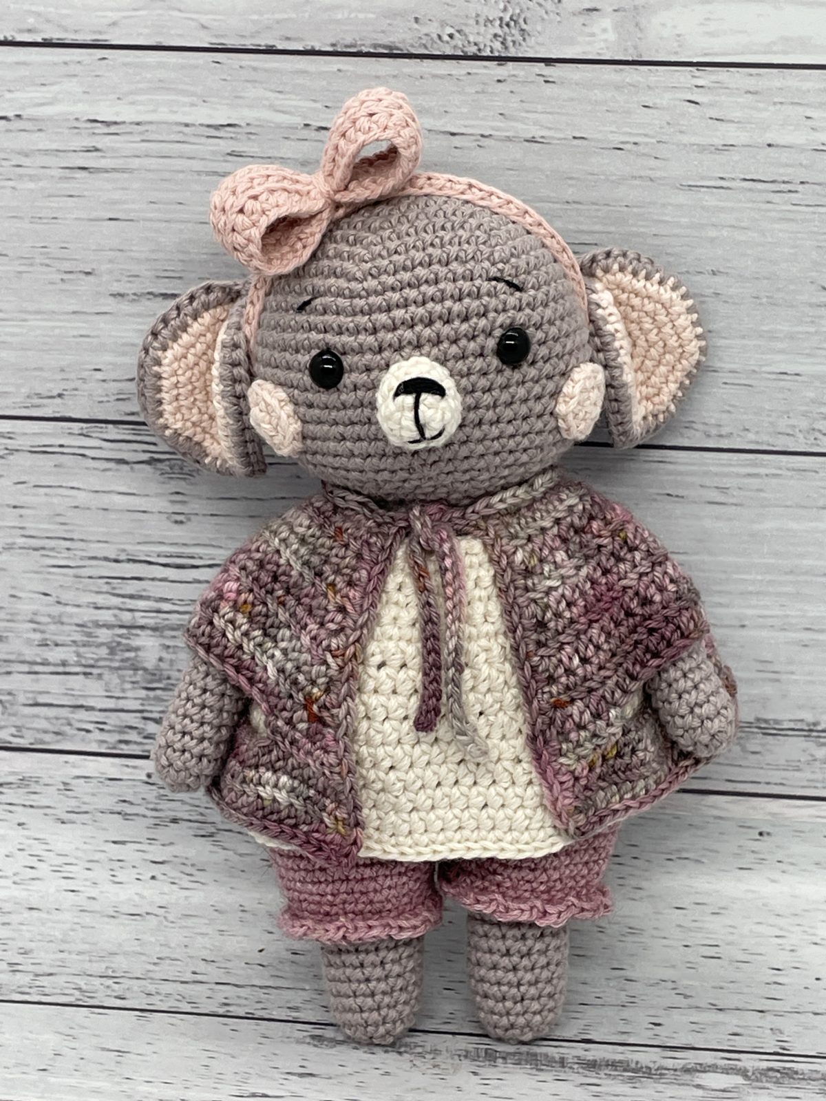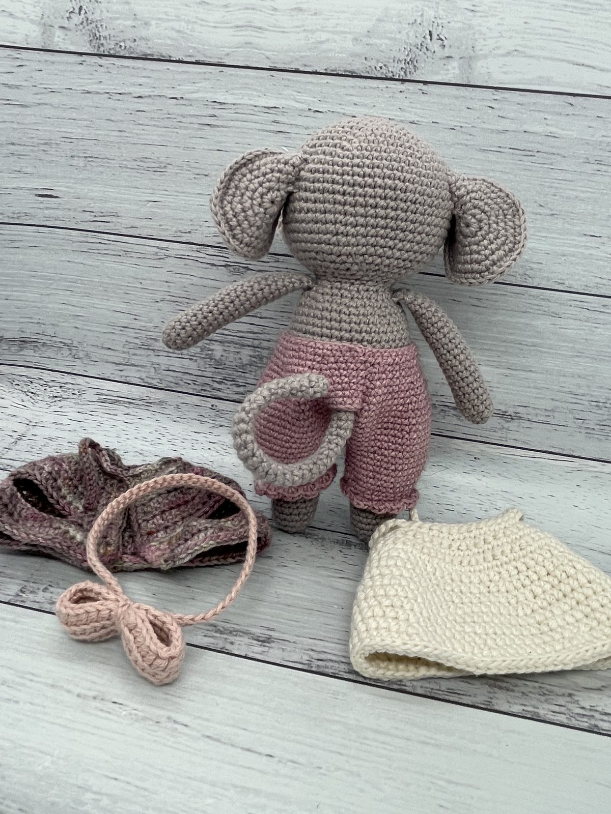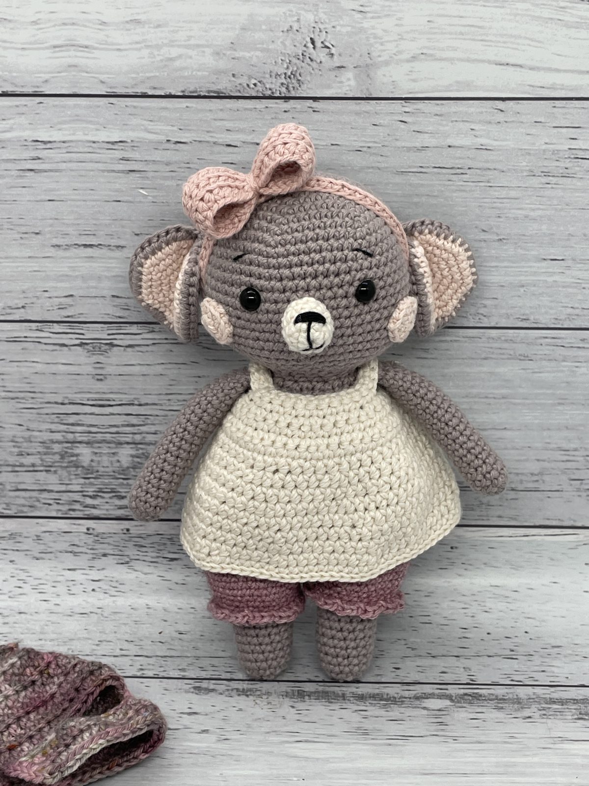 Introducing Mabel the Mouse! Mabel is made from a pattern by PicaPau using Kreadeluxe organic cotton yarn, Zealana possum and merino blend yarn and hand dyed merino yarn . Mabel’s clothing and headband can be removed to encourage interactive play. Mabel is a beautiful gift idea for a baby, young child or any mouse enthusiast.