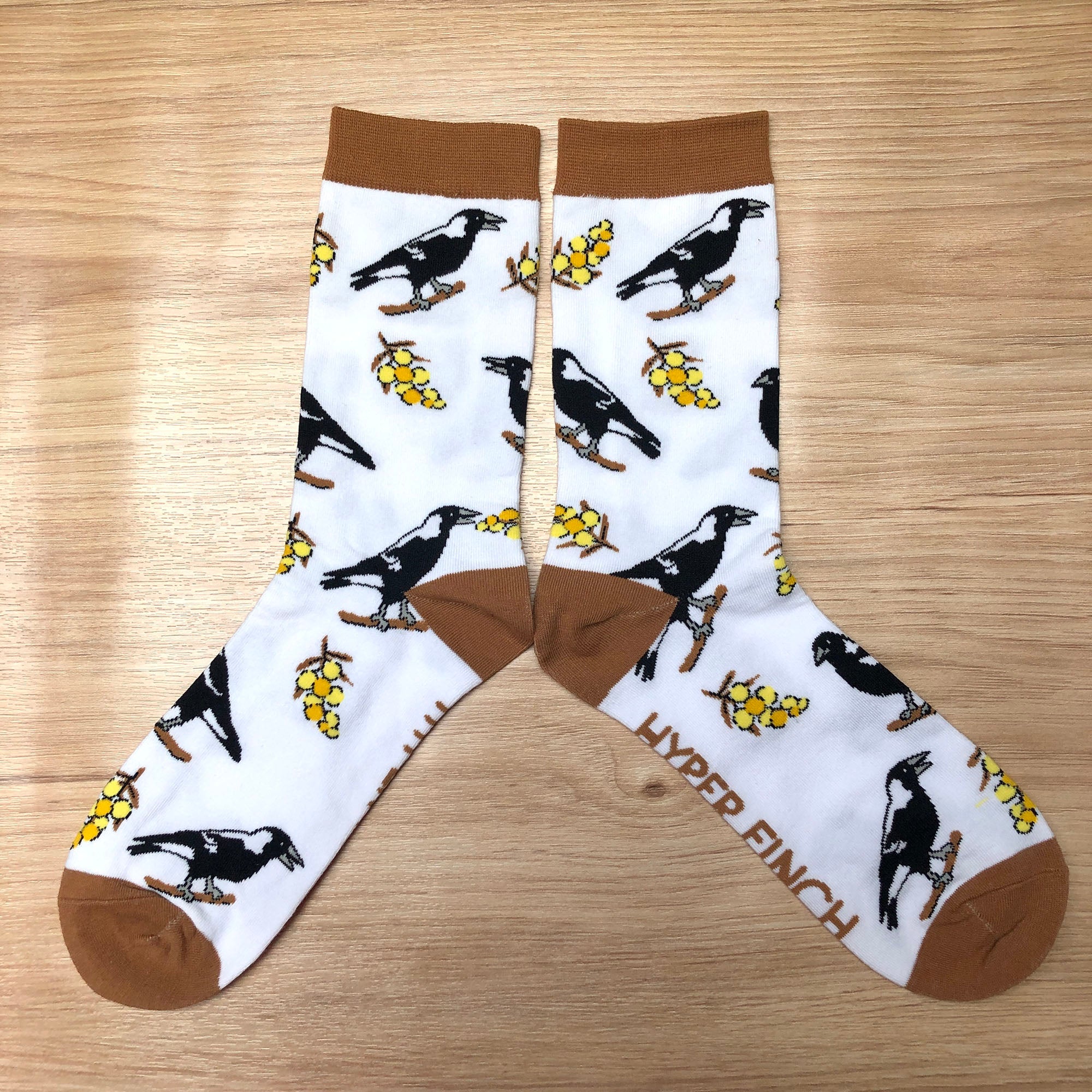 Magpies have swooped in! If their song doesn’t charm you then we’re sure these socks will! The design features Australian Magpies and Wattle. They are available in two colour ways – Yellow or White.