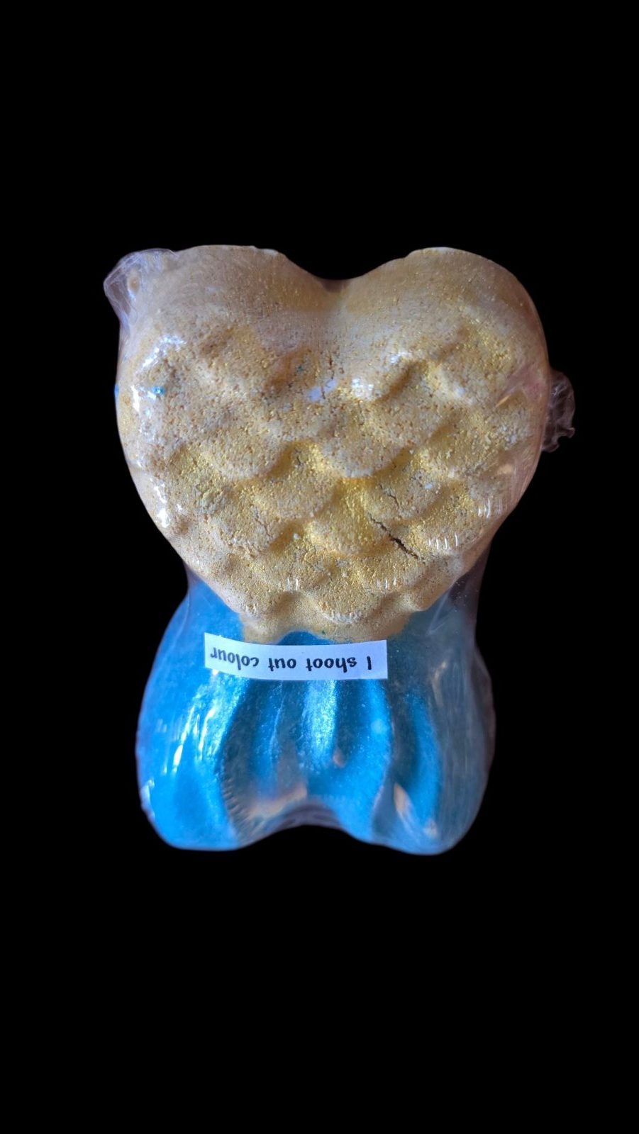 These mermaid tail bath bombs are two toned on the outside, but on the inside are hidden coloured embeds that will shoot out colour in the bath.Â