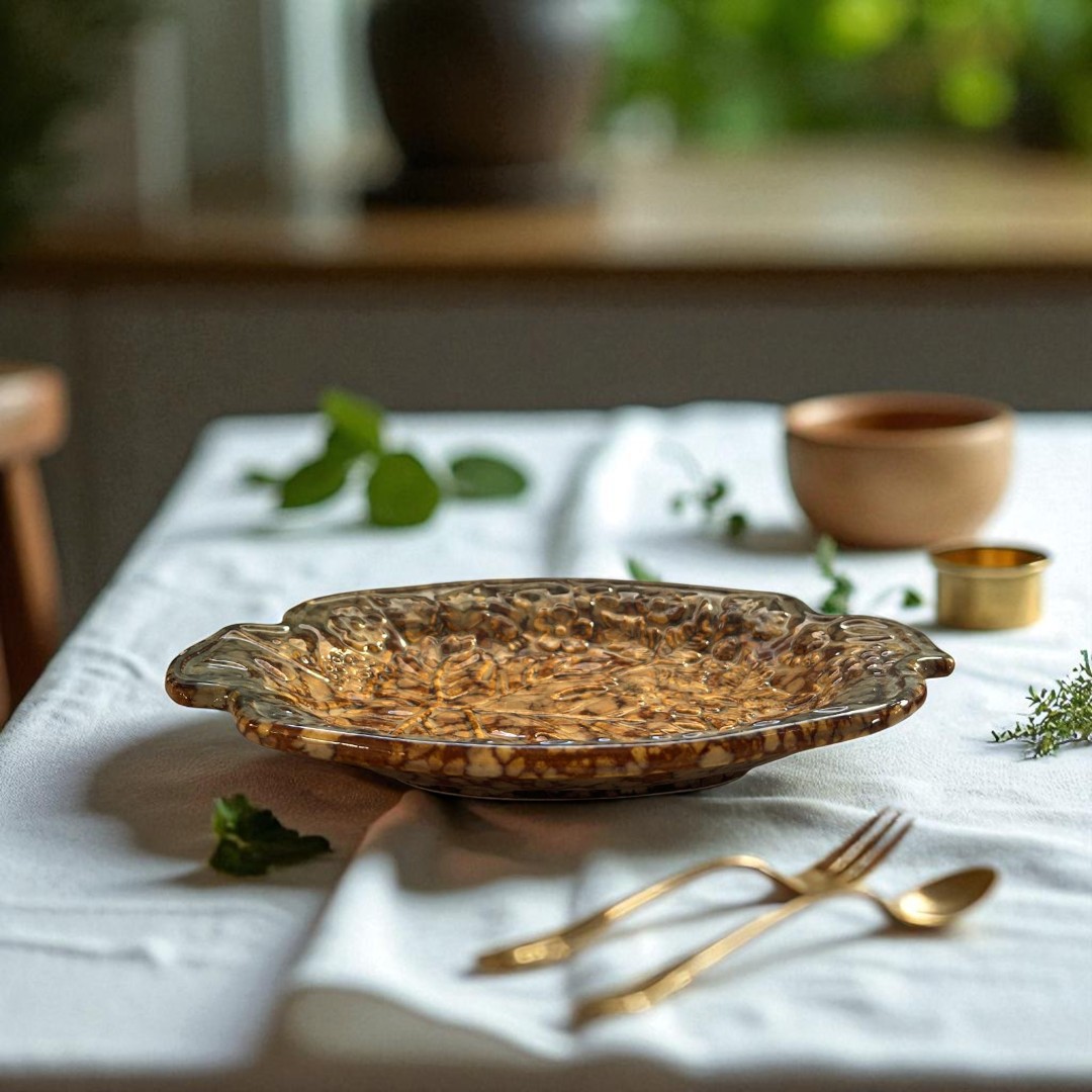The glaze shifts from a deep forest moss green along the edges to a warm, golden-brown glow toward the centre, giving the platter a radiant, earthy depth. Perfect for serving, displaying, or as a statement centrepiece, it celebrates the enchantment of the natural world while embodying the spirit of handcrafted magic.