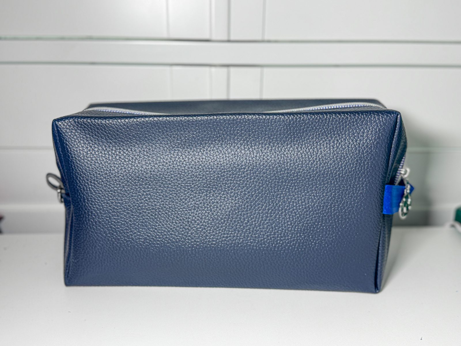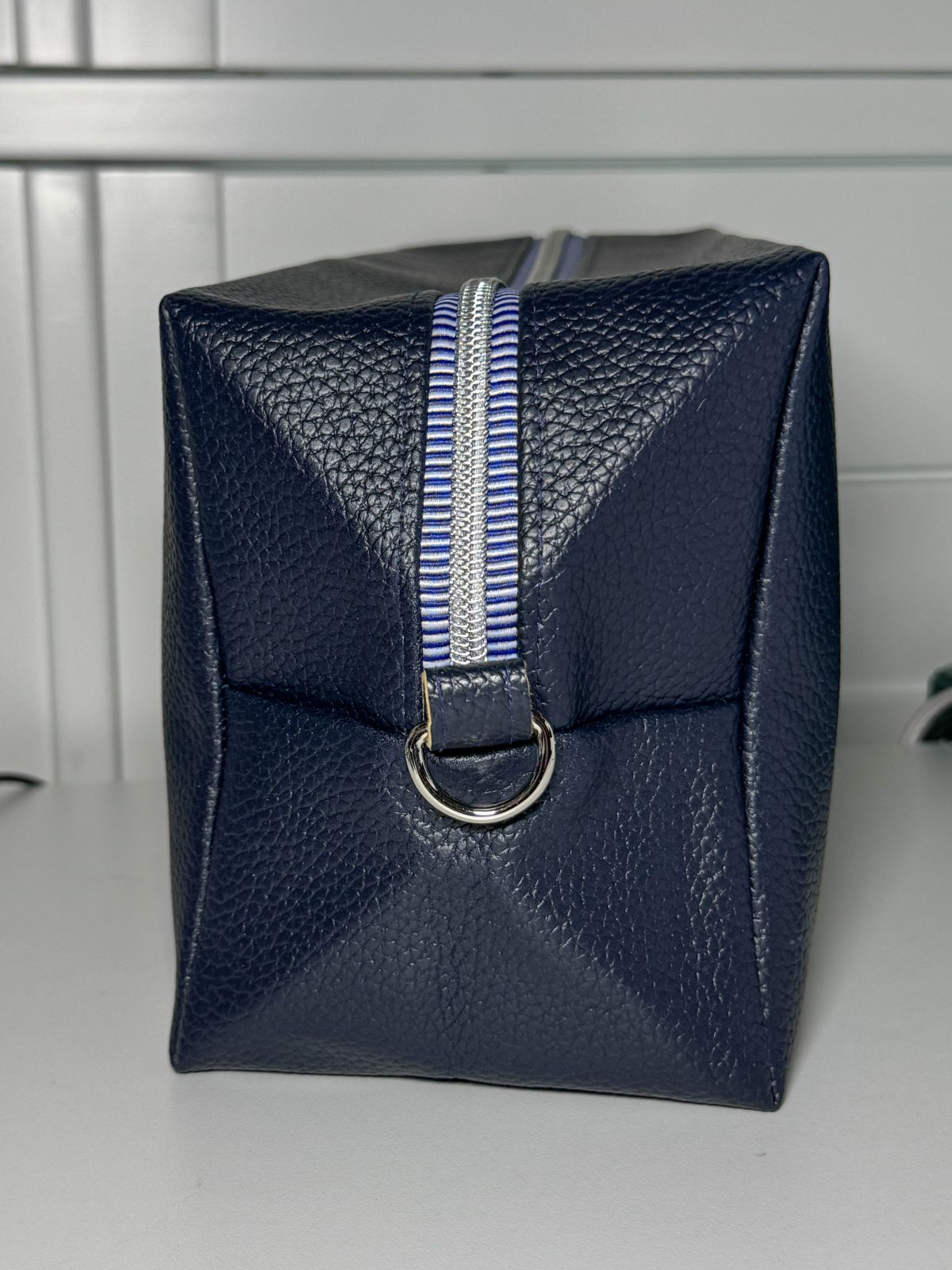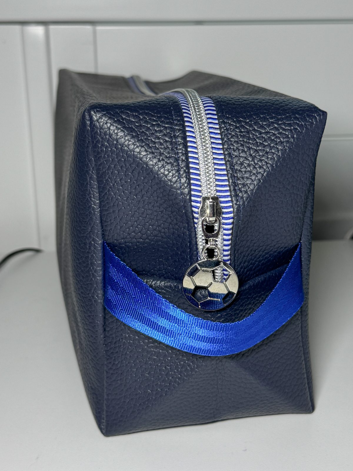 This textured navy boxy pouch is made from a synthetic leather outer, lined with cotton and features a silver-colored soccer ball zipper with blue webbing strap.