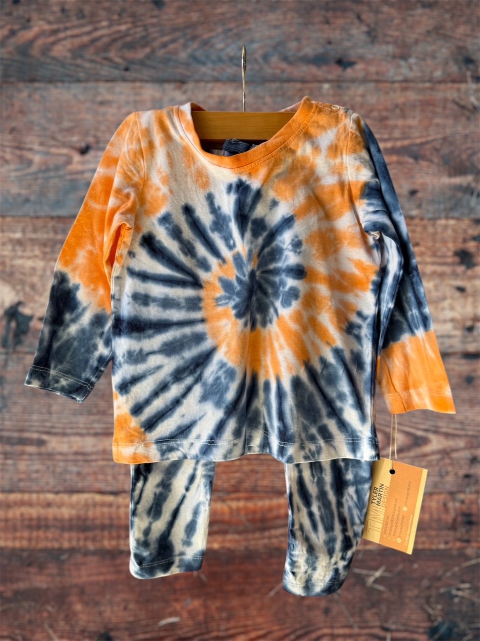 Handmade orange and dark blue set with a long sleeved top and leggings.