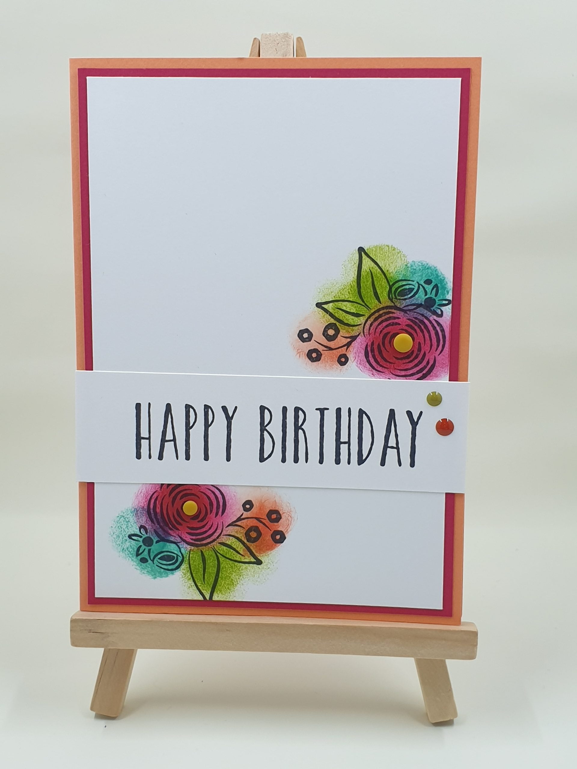 A6 size orange base with pink matte, white layer with stamped flowers and Happy Birthday stamped on front. Blank white panel inside. Envelope included.