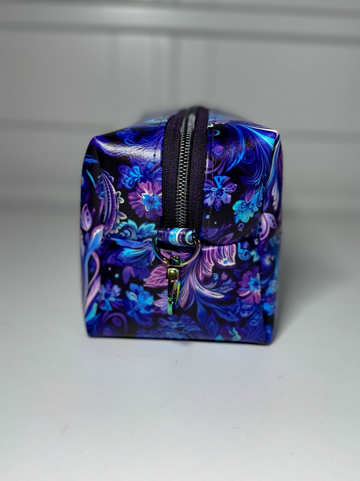 This paisley printed boxy pouch is made from a synthetic leather outer, lined with cotton and features a rainbow-colored zipper and snap hook with blue webbing strap.