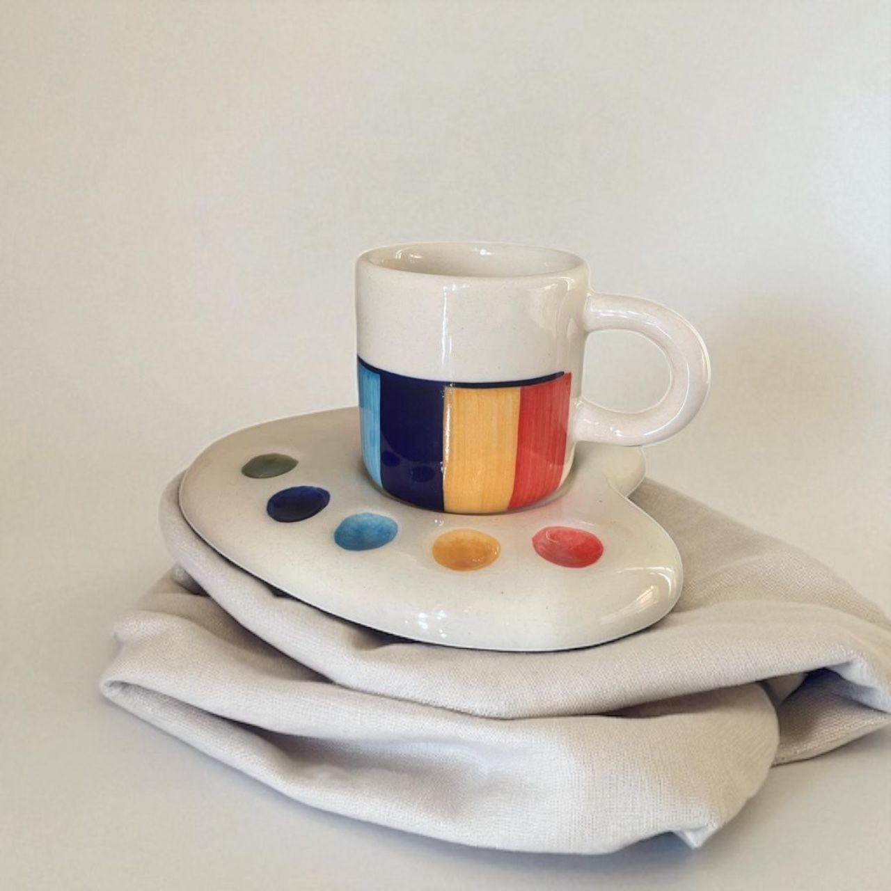 Paired with a saucer shaped like a painter’s palette, complete with delicate wells and hand-painted colour spots, this set celebrates artistry and imagination. Every cup and saucer is carefully handcrafted and glazed, making each set a unique, one-of-a-kind masterpiece.
