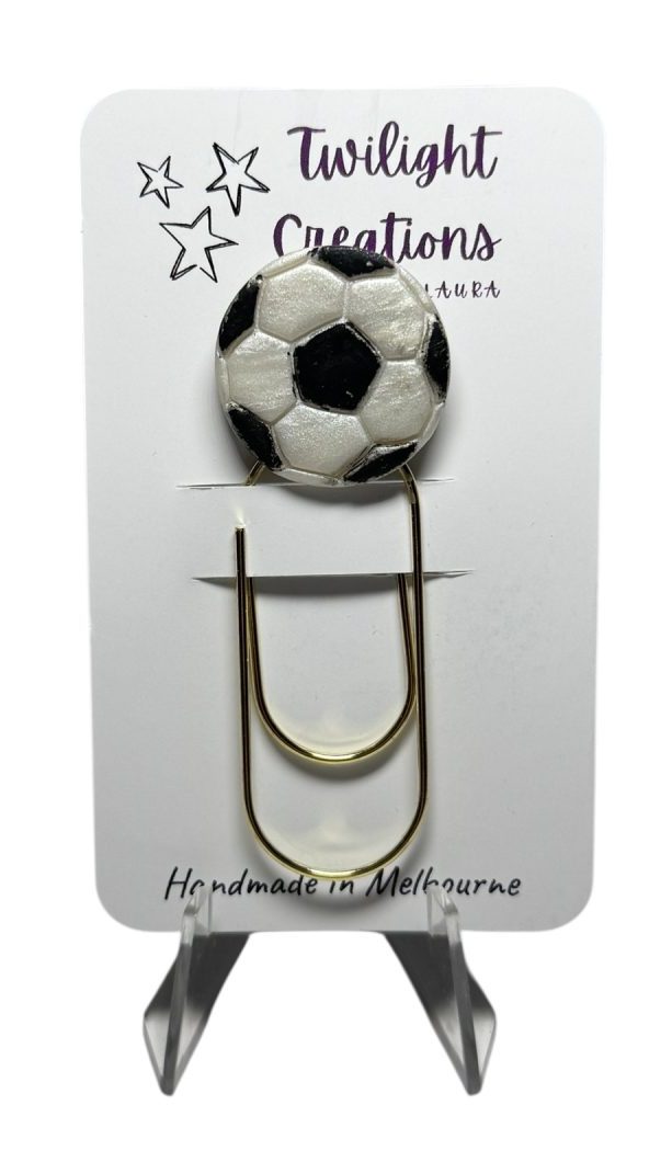 This bookmark is made with a large metal paperclip, fitted with a polymer clay Soccer ballÂ
