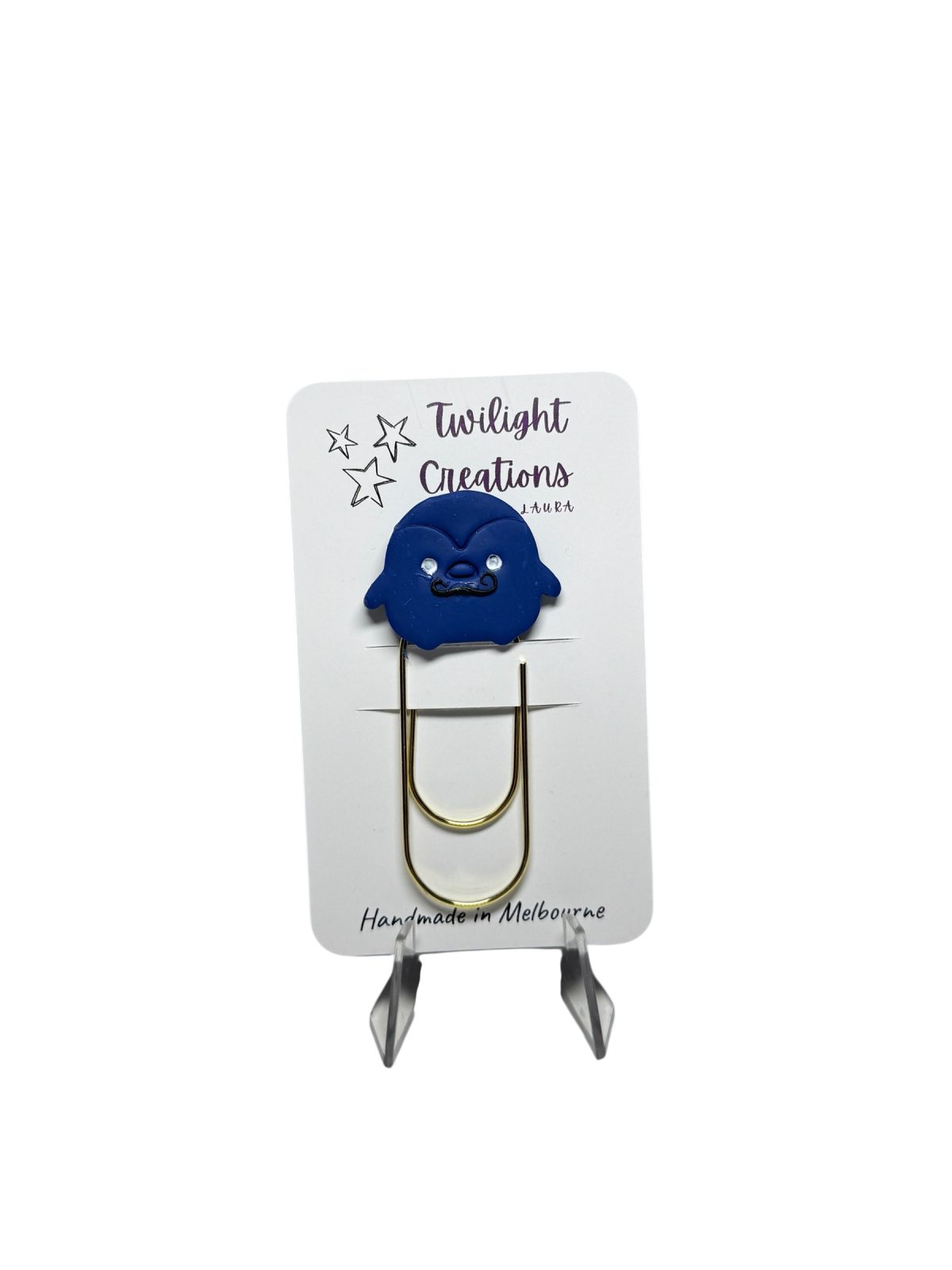 This bookmark is made with a large metal paperclip, fitted with a polymer penguin sporting a curly moustacheÂ
