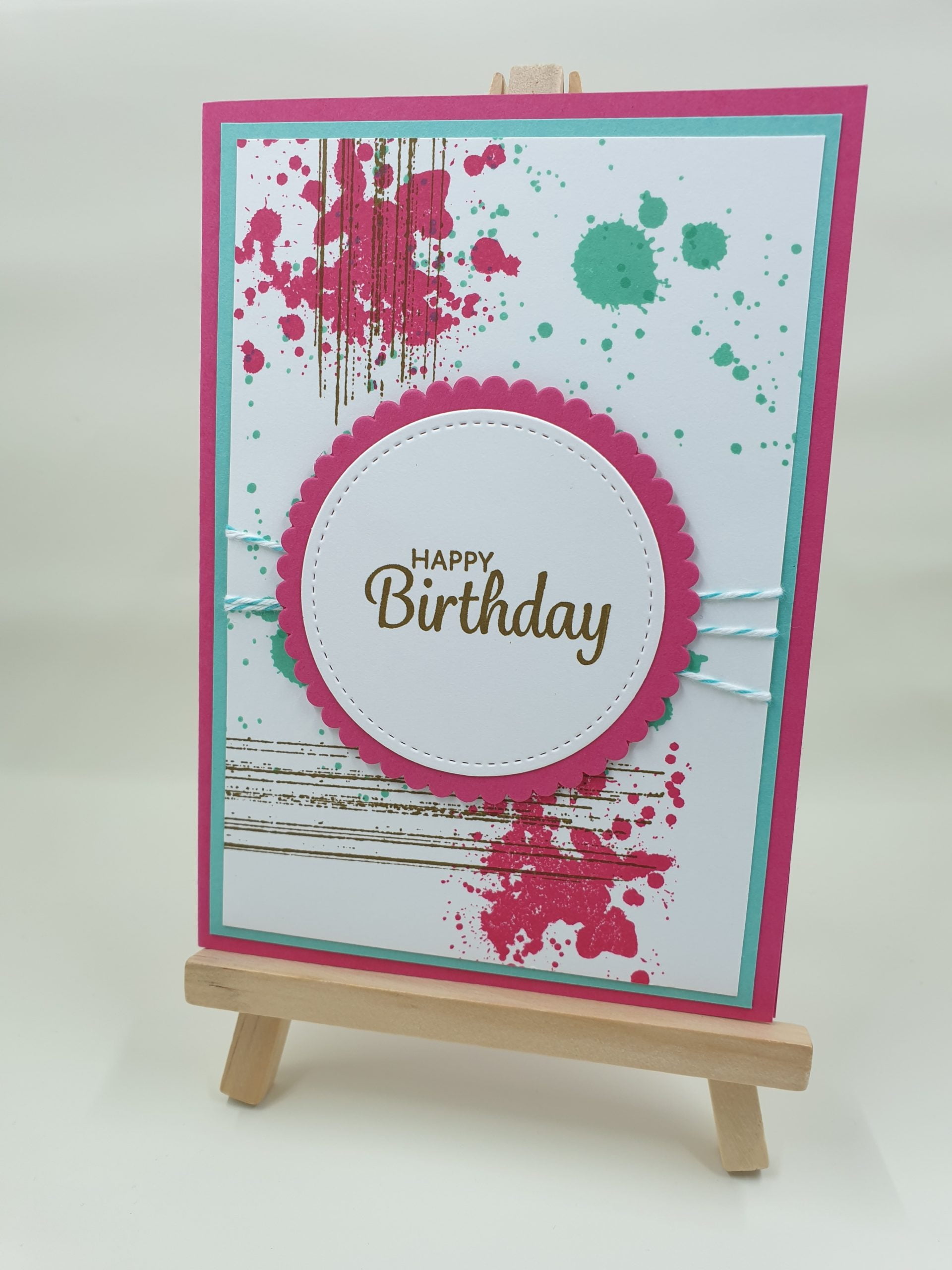 A6 size pink base, light blue matte, white layer with pink, blue & brown splotches stamped on. Blue twine wrapped around layers and pink scallop circle with white circle on top, happy birthday stamped in pink. Blank white panel inside. Envelope included.