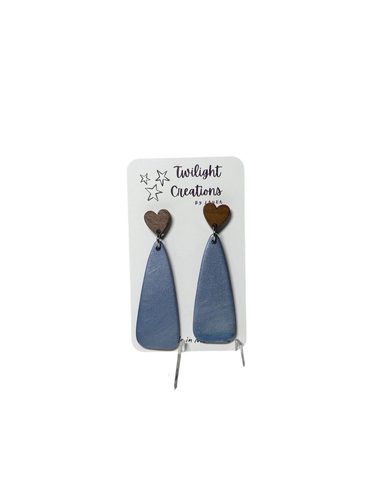 These earrings are handmade using polymer clay and feature a wooden heart with surgical stainless steel earring post, fitted with a cornflour blue, tapered triangle dangle.