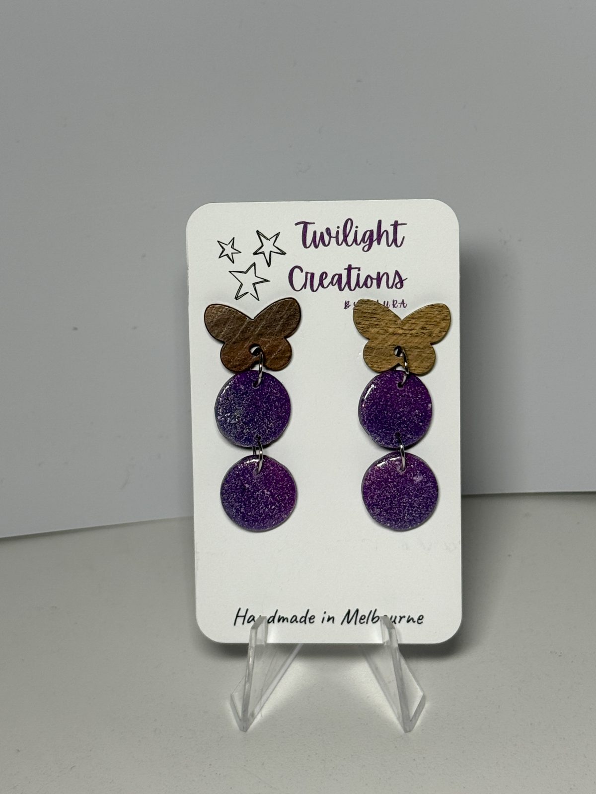 These hand-crafted polymer clay earrings feature a wooden butterfly stud with surgical stainless-steel post which are fitted with 2 purple glittery circles.