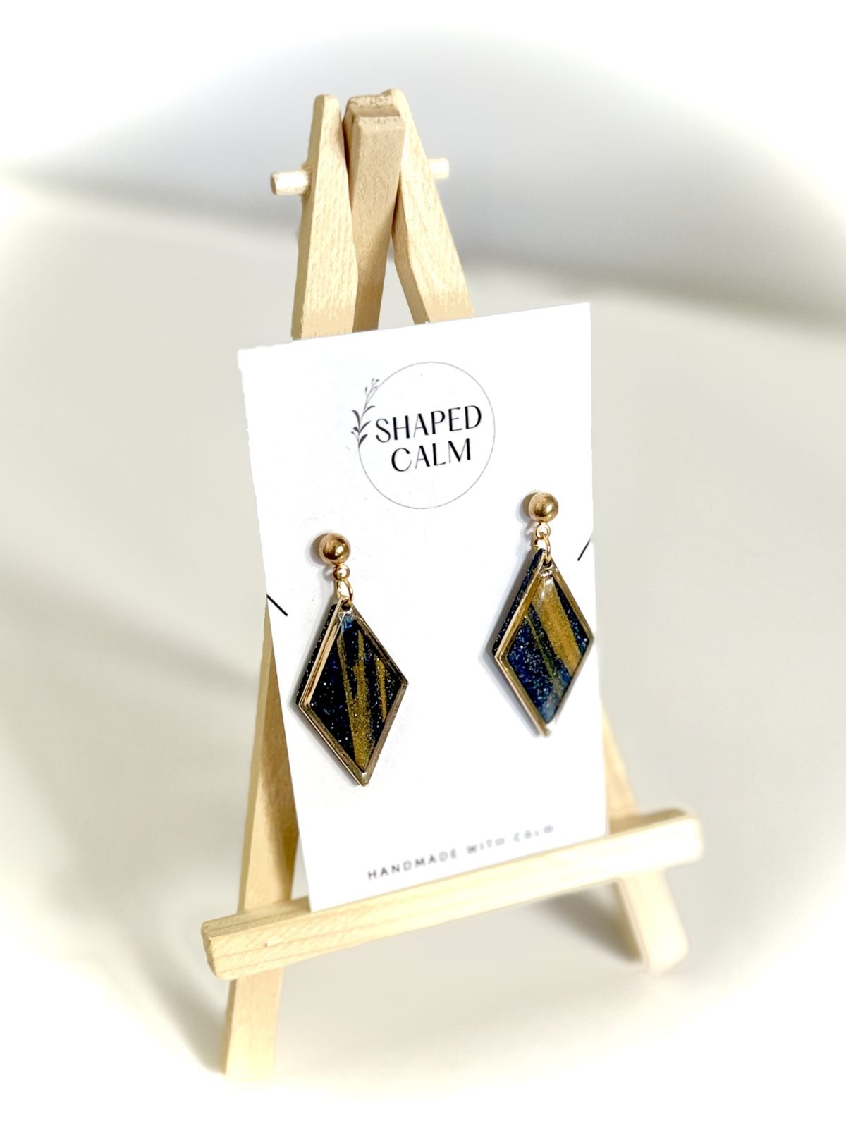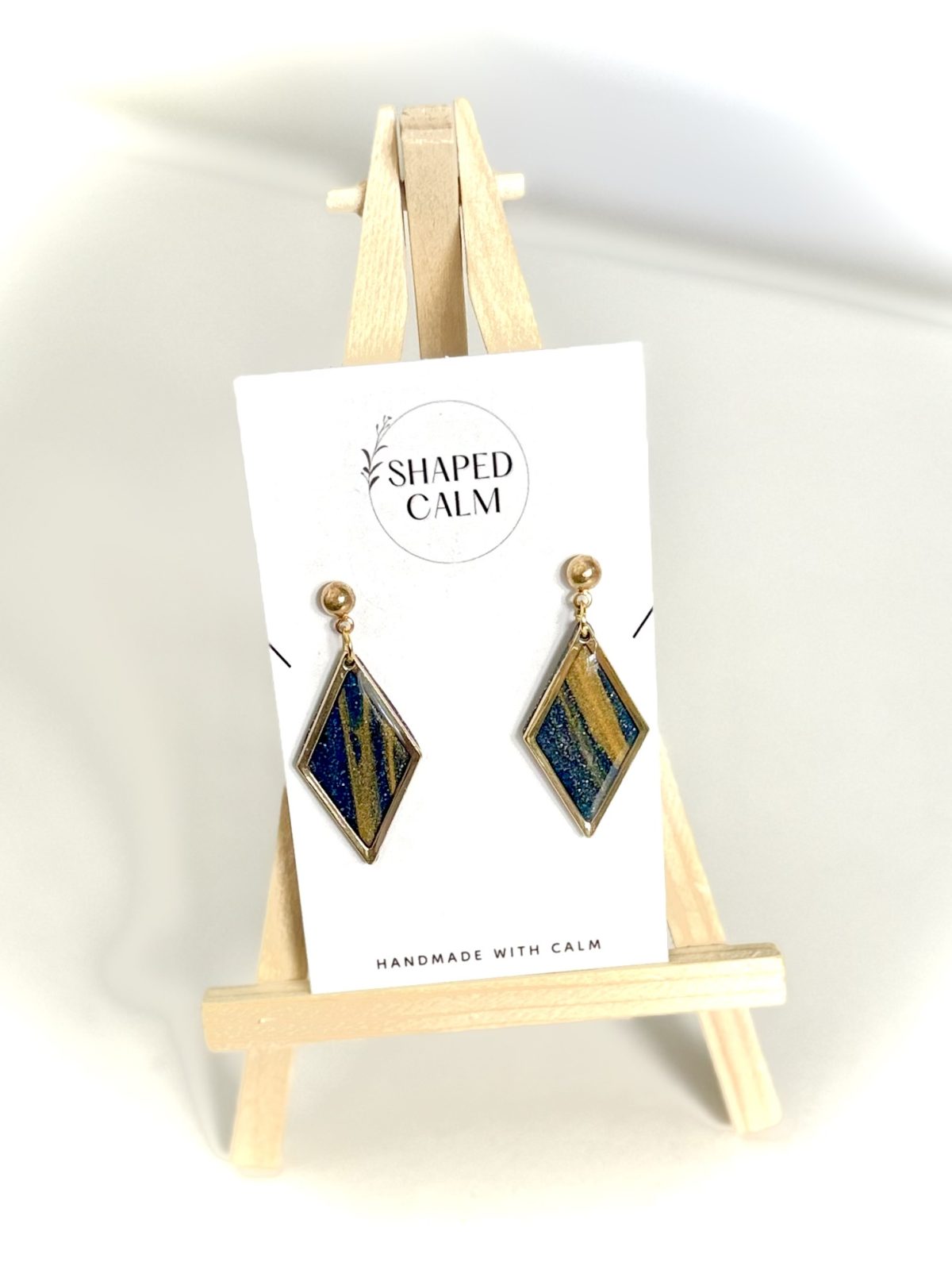 Add a touch of elegance with these handmade blue and gold polymer clay earrings. Featuring a sleek geometric diamond shape, they shimmer with a sophisticated blend of deep blue and gold accents. Lightweight and comfortable, they’re perfect for special occasions or everyday glam. A stunning gift for someone who loves unique jewelry.