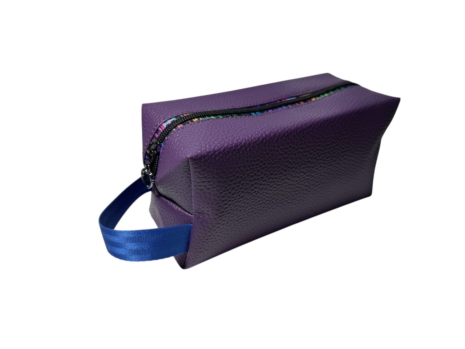This purple boxy pouch is made from a synthetic leather outer, lined with cotton and features a gunmetal-colored zipper and snap hook with a blue webbing strap.