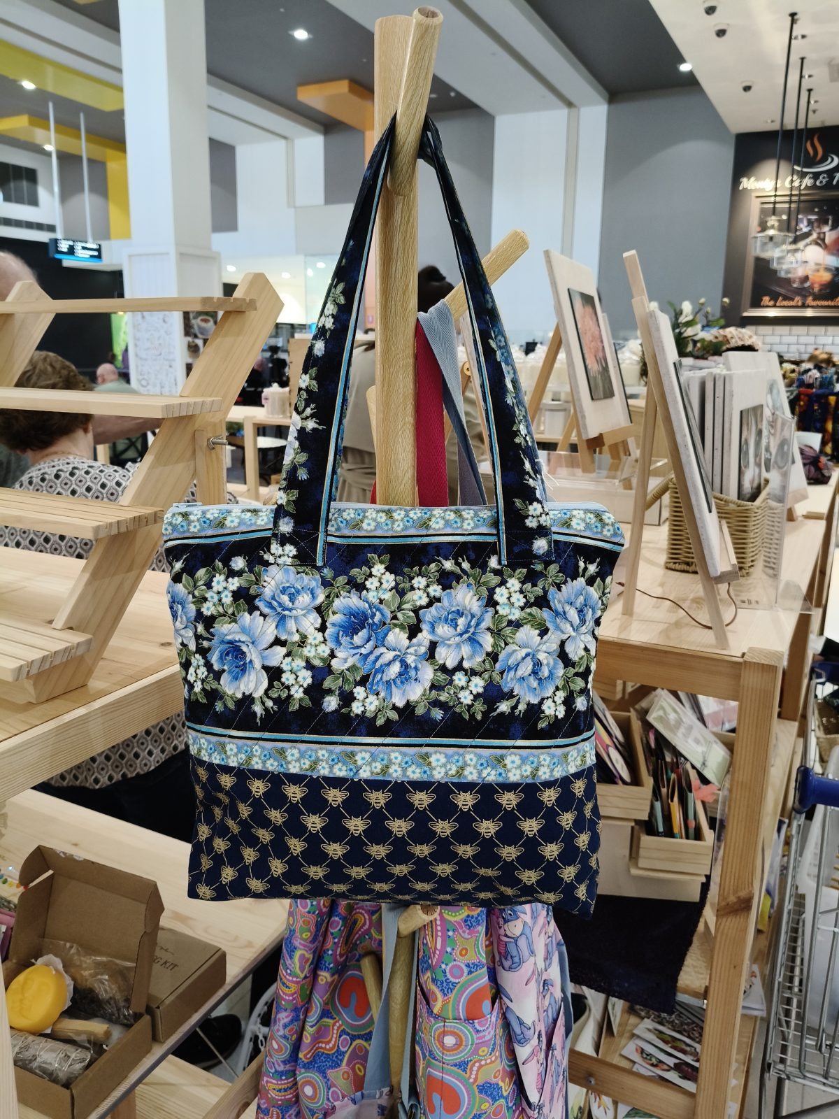 Quilted Bag, handmade in cotton with various patterns and with a boxed bottom. Bag consists of zip, thick handmade handles and an inside pocket. Measurement is roughly 11×11 inches.Â