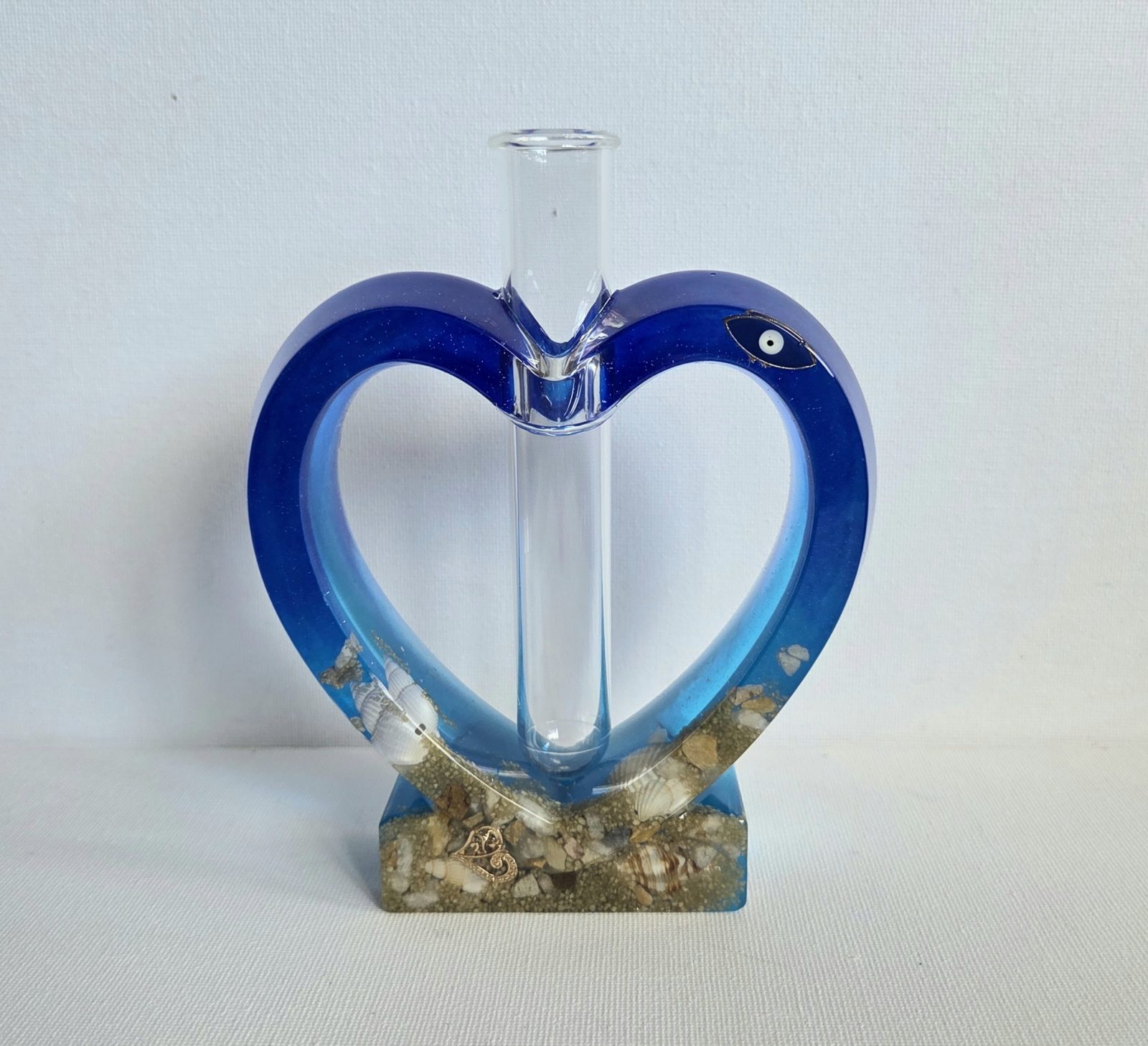 Bring the calm and beauty of the ocean into your home with this handcrafted resin propagation vase. Designed in a soothing blue ocean theme, it features real shells, natural sand, a delicate gold filigree heart, and the symbolic evil eye charm for protection and positivity.