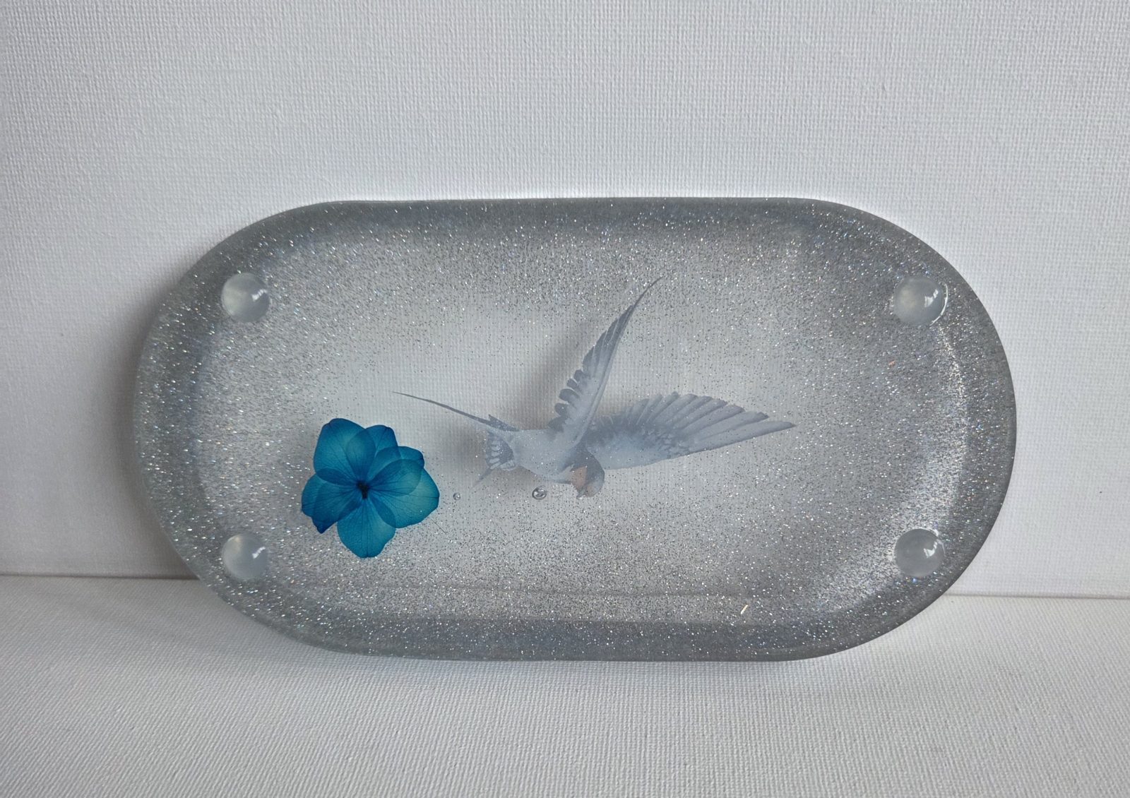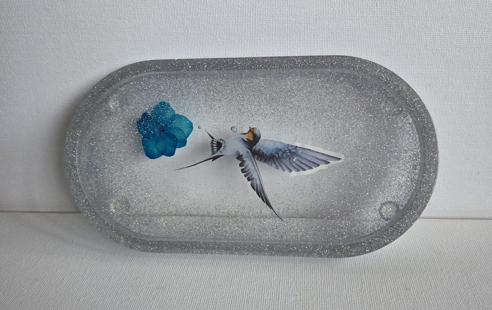 Resin Trinket Tray – Birds in flight silver sparkle