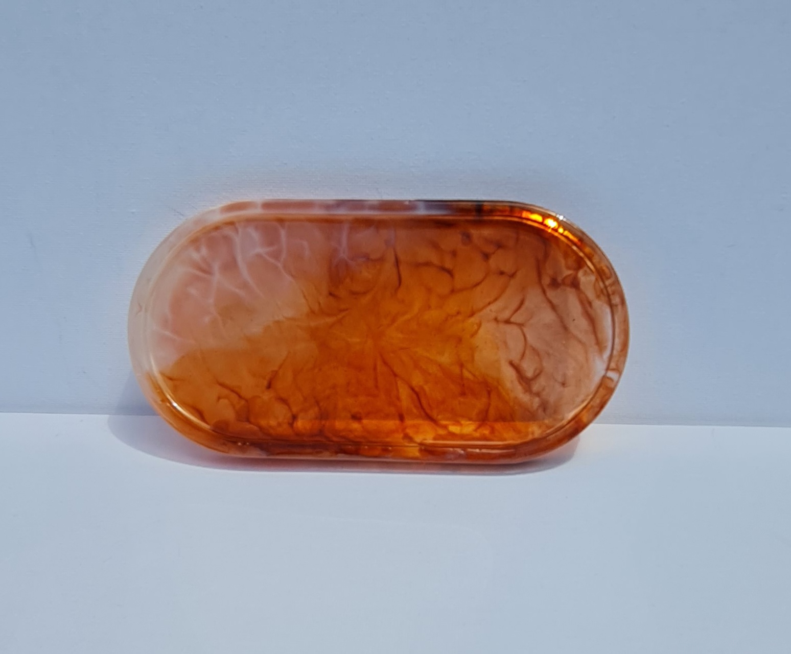 This elegant oval shaped trinket tray has beautiful ink swirls of bronze, white and clear within a glossy resin. Perfect for holding jewellery, keys or perfume within your home décor.Â