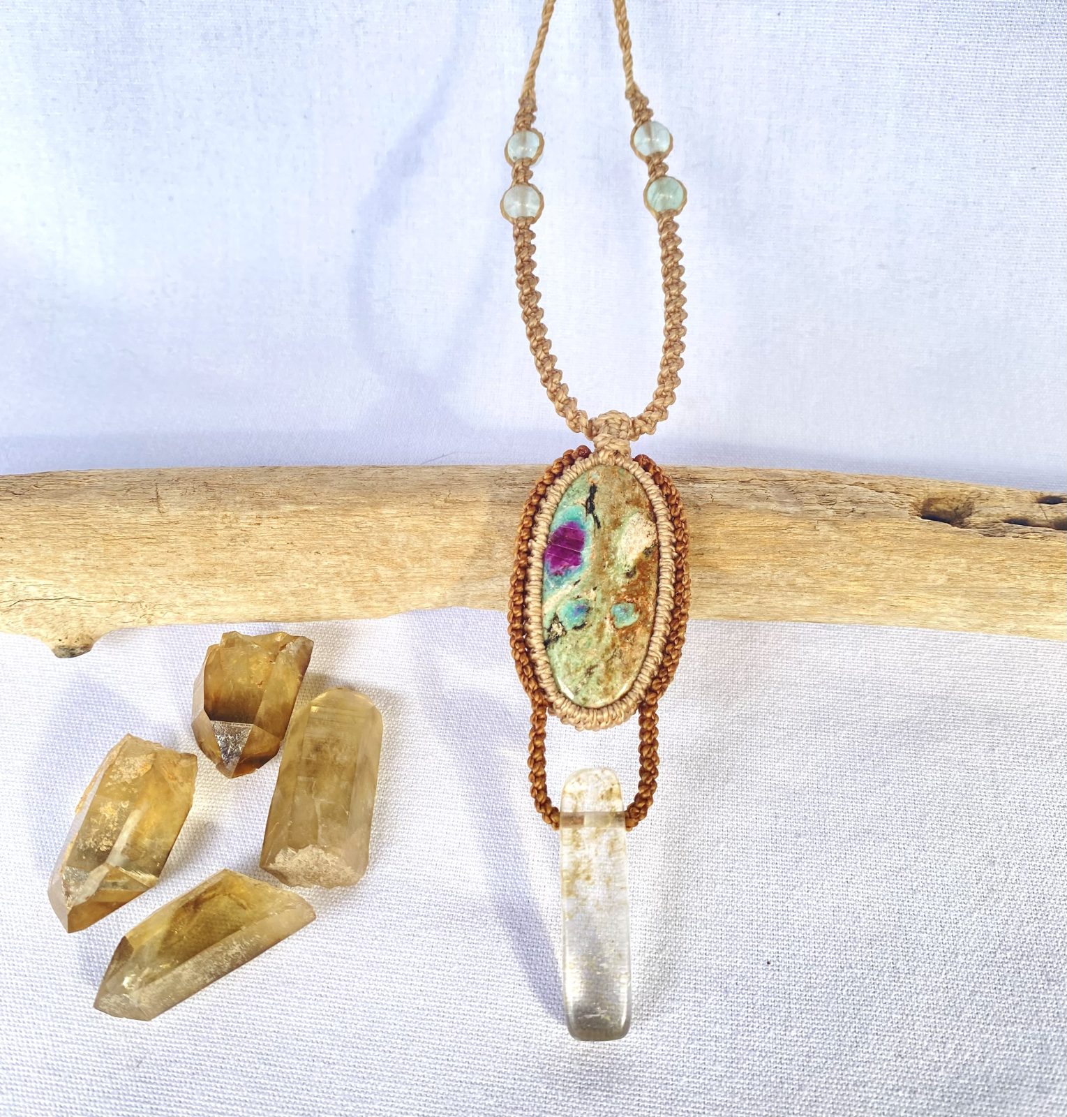 Ruby Fuschite And Quartz Handmade Macrame Crystal NecklaceRuby Fuschite And Quartz Handmade Macrame Crystal Necklace