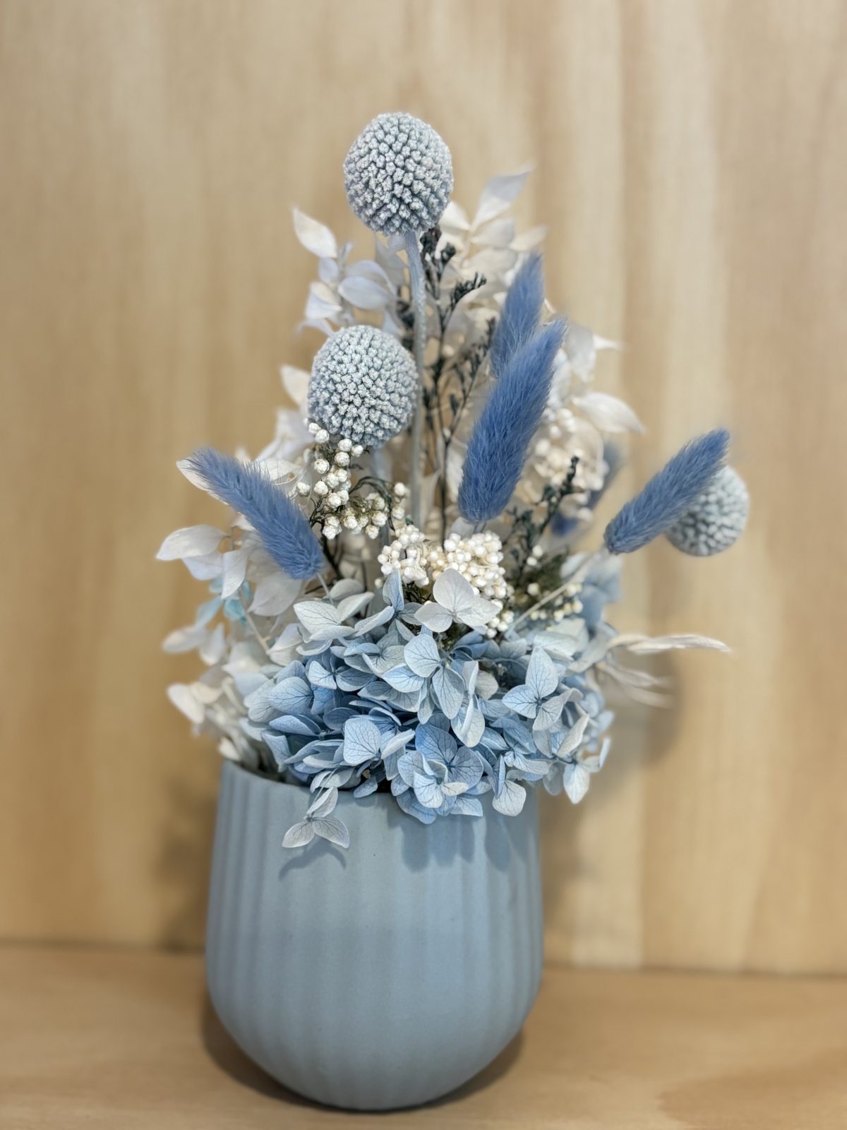 Small blue vase blue/white dried flowers
