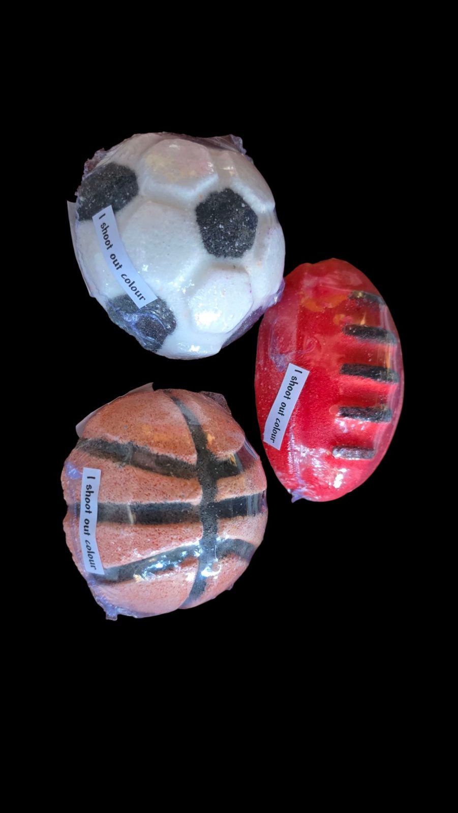 These are available in either a Soccer ball, Basketball, or Football. Each are hand painted and on the inside have a hidden coloured embed that will shoot out colour in the bath.Â